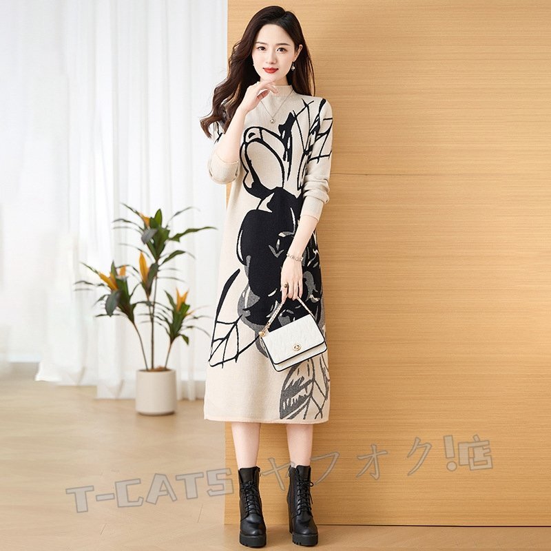 新品ニットワンピース 秋冬 長袖 プリント柄 膝丈ワンピース カシミヤ混 着痩せ 通勤 上品大人 ひざ丈ワンピースベージュ 收藏