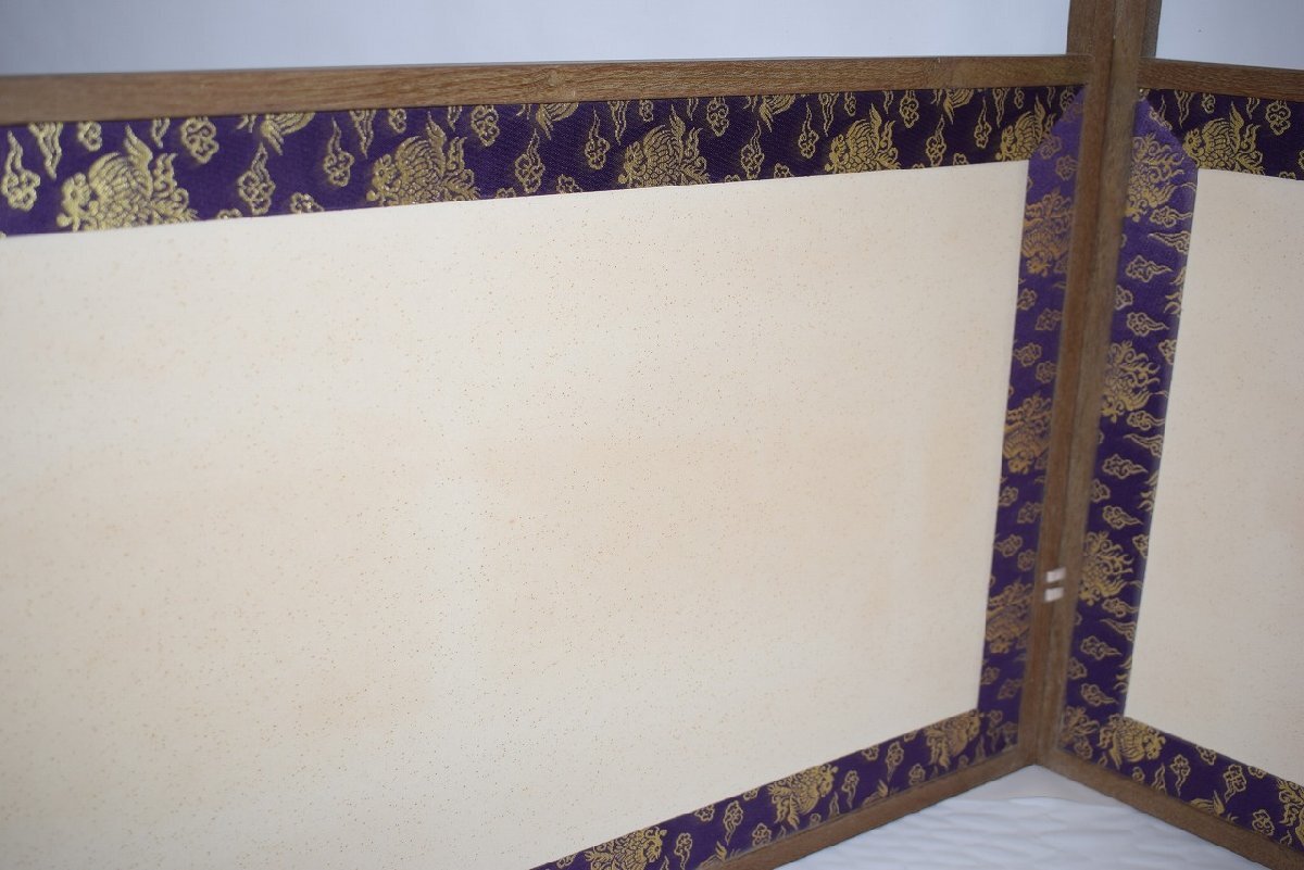 茶道具 風炉先 玉桑縁 雲鵬 大徳寺 三玄院 長谷川 寛州 花押 京間用 風炉先屏風 茶道 07-8519 94×54.5cm 厚1.7cm 腰板の部分下から縁含む39cm 当たり、日焼け、シミ、擦れはありますが、本体はしっかりしています、お稽古にお使いになるには差し支えありません。注)商品のサイズと性質上、同梱包できない場合があります。