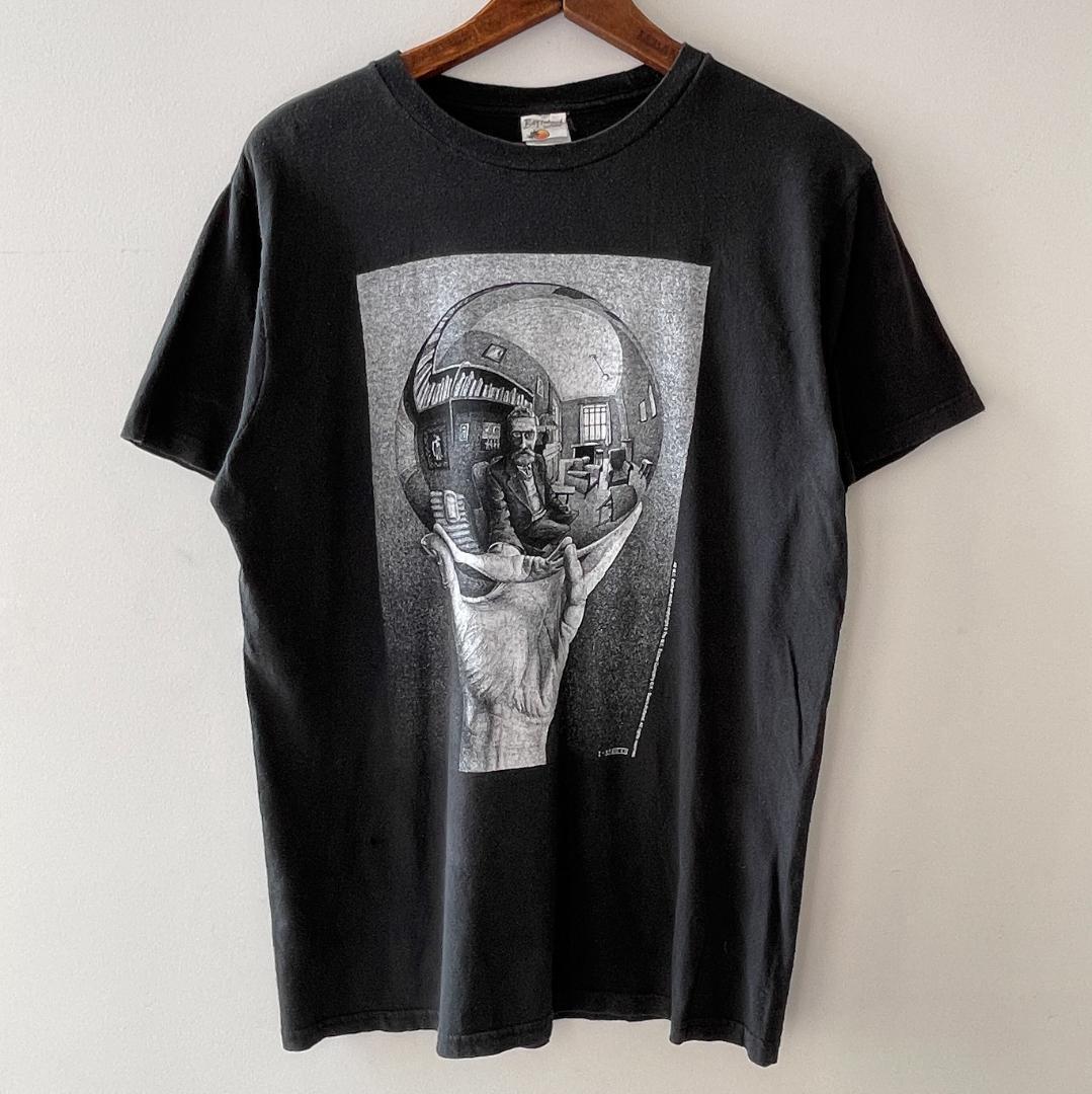 GG272 90s Tシャツ MCエッシャー アート M.C.Escher 写像球体を持つ手 ビンテージ 古着 シングルスチック Lサイズ bay islandタグ 黒T 收藏