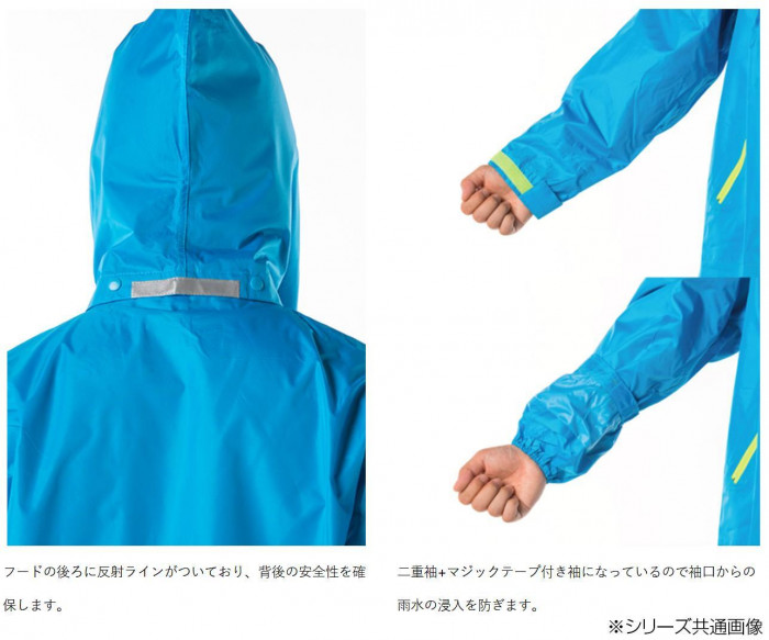 | 仕様 | 耐水圧:20000mm(初期値) ・防水加工 ・撥水加工 ・ビニル付き着脱式フード ・二重袖+マジックテープ ・前開きパンツ ・両腰ポケット ・ベルト通し ・反射ライン ・ブリーズブロンズ(R) |