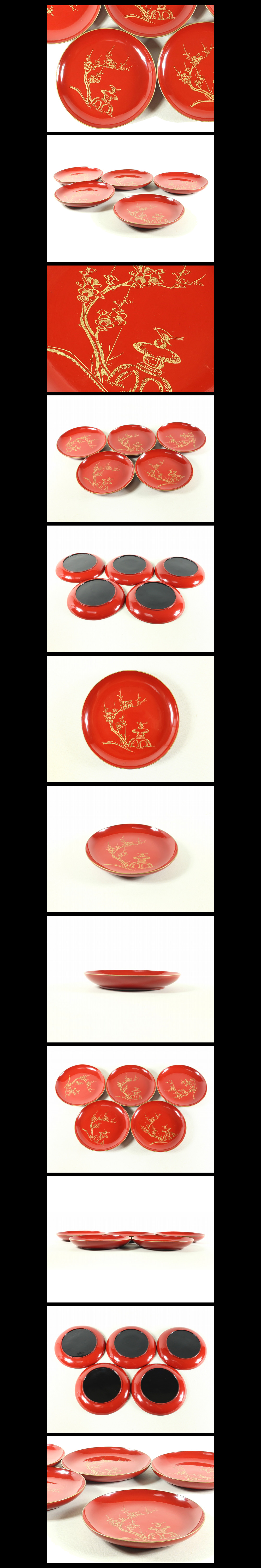 ●c2091●【沈金銘々皿5客 梅鶯 朱金縁 六寸弱/木皿菓子皿菓子盆銘々盆】検お茶会煎茶道具茶懐石道具蒔絵●西瓜● 收藏