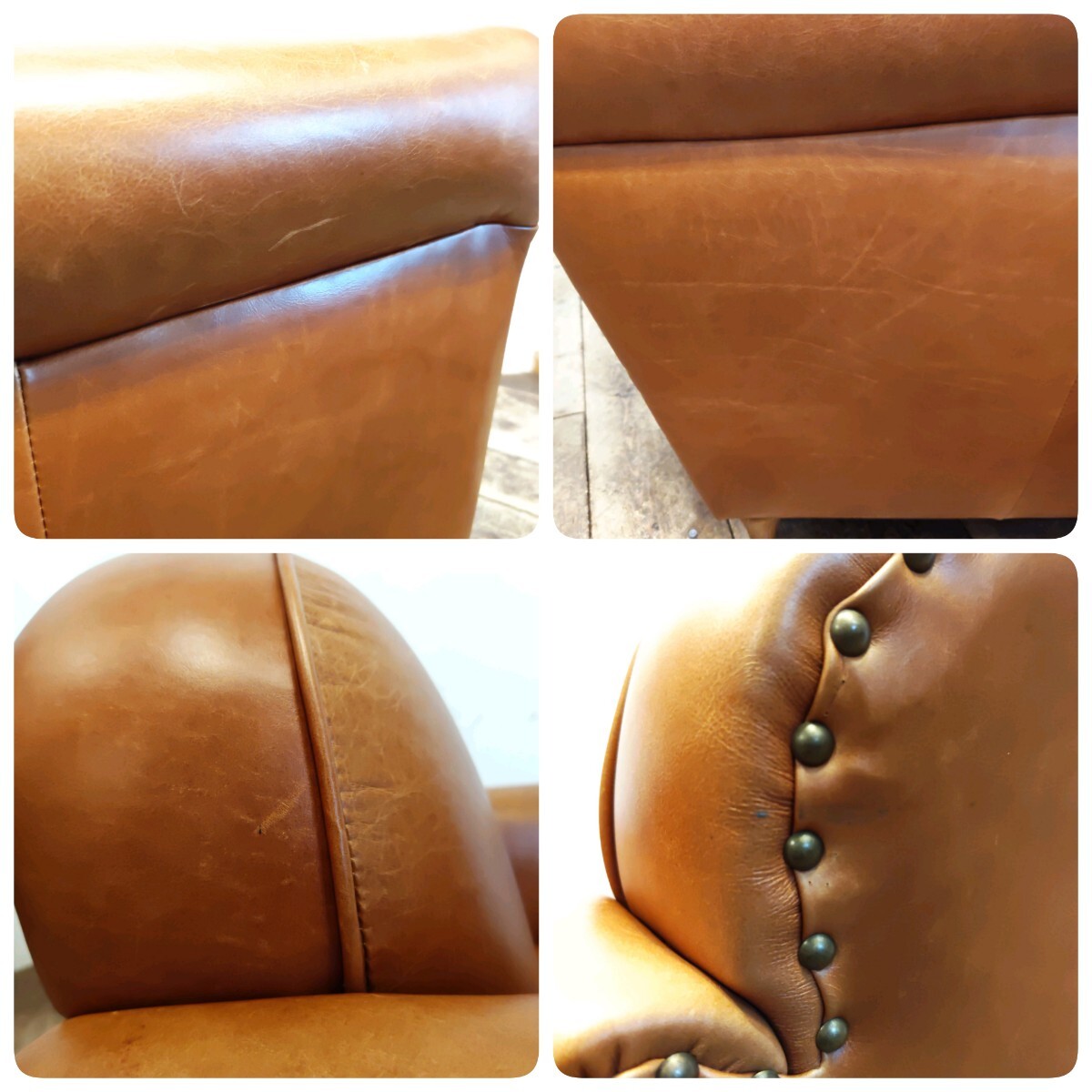 張り地はクラックレザーですので革の表面のコーティングをクラックさせて革が割れているような表情を出しています。割れているのはコーティング部分なので、革自体の機能、耐久性には問題ございません。※新たにできた傷や押し跡、くすみ、汚れ、擦れ等がありますが破れや致命的なシミは見られません。
