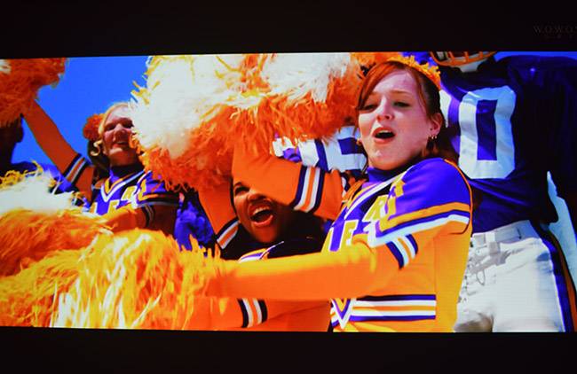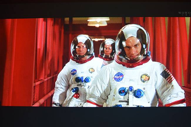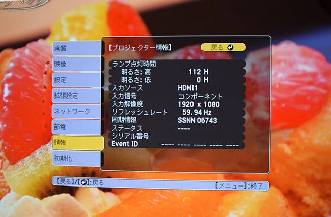 ランプ使用時間少ないため色彩鮮やかに鮮鋭感のある映像が映し出されています。4200ルーメンの高輝度はさすがに明るく、部屋の蛍光灯下でも十分鑑賞できるほどで、スクリーン全体に力強さがあります。細部表現力や階調表現力も秀逸で、低照度シーンの微妙な陰影表現から高輝度シーンのハイライト表現までEPSON 3LCDらしい濃密な色彩で描き分けているのがわかり、色純度の高さが印象的です。実写映像は添付写真をご覧ください(120インチホワイトマットスクリーンに当出品機で実際に投射した映像です)。