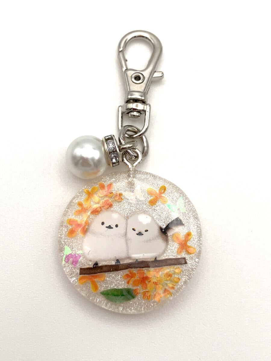 メモリーオイル キーホルダー チャーム ストラップ パール シマエナガ アクセサリー レジン 北海道の野鳥 御守り かわいい 金木犀 秋