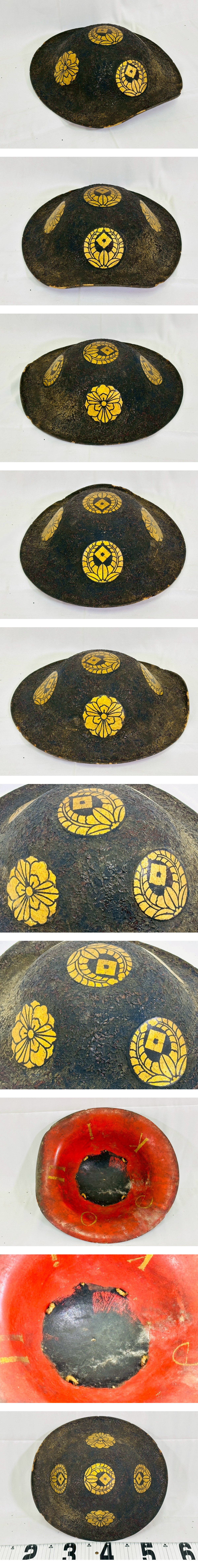 【武具】江戸期 黒漆塗り 陣笠 兜 家紋入 銭紋系 菊花紋 時代物 本漆 武士具 骨董品 武家装束 軍陣具 旧蔵出 コレクター放出品 現状品 收藏
