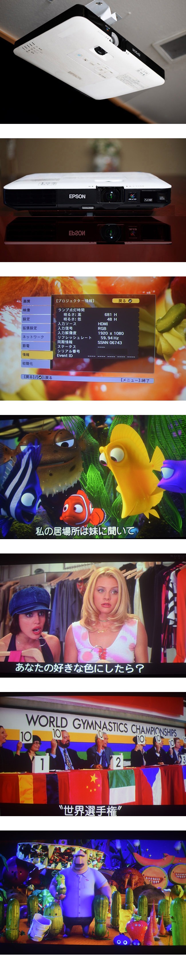 色彩鮮やかに濃密な映像です。輝度は使用時間相応で僅かにくすみを感じますがスクリーン全体に力強さがあり細部表現力や階調表現力も秀逸です。低照度シーンの微妙な陰影表現から高輝度シーンのハイライト表現までEPSON 3LCDらしい濃密な色彩で描き分けているのがわかり、彩度の高い映像で色純度の高さが印象的です。各シーンの背景部分のディテールも繊細に描き出しているのが判り、細部にわたり素材の質感を感じさせる緻密なフルHD映像の描写力は素晴らしいと感じます。実写映像は添付写真をご覧ください(120インチホワイトマットスクリーンに当出品機で実際に投射した映像です)。