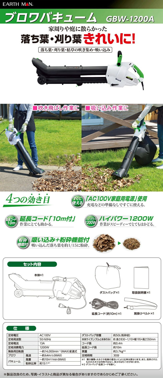 EARTHMAN(高儀) ブロワバキューム GBW-1200W を出品いたします。 ■特徴■ 家周りや庭に散らかった 落ち葉・刈り葉きれいに! 「AC100V家庭用電源」使用 充電などの準備なしですぐに使える。 延長コード「10m付」 作業にとても助かる。 ハイパワー1200W 作業がスピーディーでとてもはかどる。 吸い込み+粉砕機能付 吸い込んだ落ち葉を約1/15に粉砕。 ■仕様■
