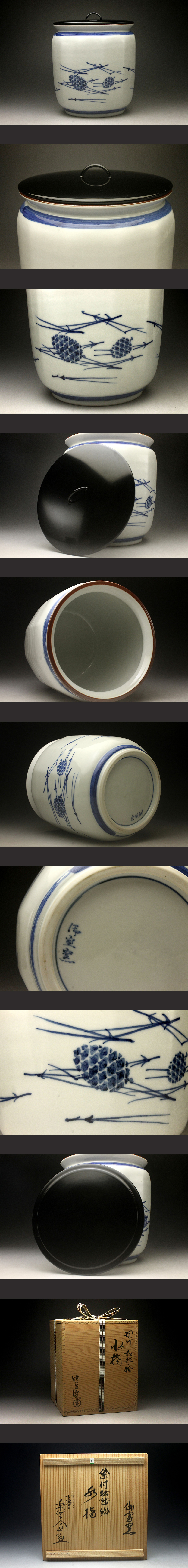 【余韻】 茶道具 御室窯 染付 松毬絵 水指★共箱 無傷美品<同梱可> 收藏
