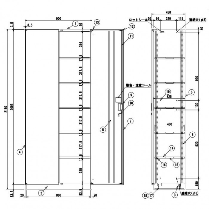 | サイズ | 外寸法:W900×D450×H2160mm、内寸法:W860×D425×H2046mm 個装サイズ:46×92×218cm |