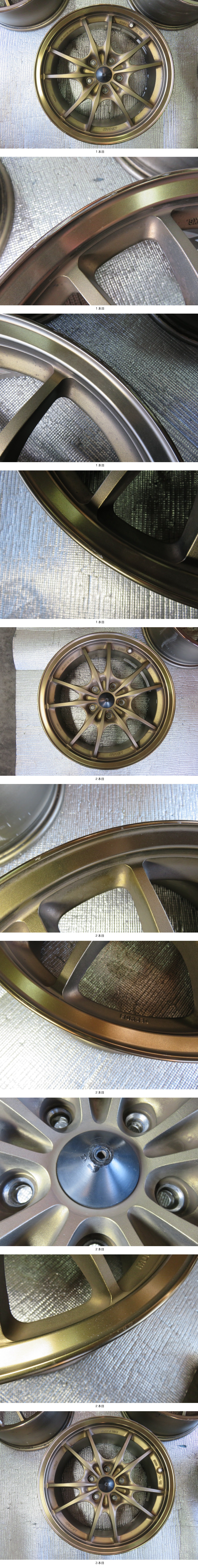 ☆★ ホイール詳細 ★☆ 【ホイール】 MUGEN(無限) MF10 【サイズ1】 17インチ 7.5J +52 5H PCD114.3 【サイズ2】 17インチ 8.5J +59 5H PCD114.3 【カラー】 ブロンズ 絶版になった当時物の無限MF10 鍛造ホイールです。 S2000サイズとして制作されたものです。 全体的にホイールの歪みフレは無く、そのままご利用可能な状態です。 1本目(画像2枚目) リム部に浅めの連続した擦り傷が見られます。 2本目(画像3~4枚目) リム部にところどころごく軽いガリ傷が見られます。無限センターキャップにガリ傷が見られます。 3本目(画像5枚目) リム部に連続したガリ傷が見られます。 4本目(画像6~7枚目) リム部にところどころガリ傷が見られ、スポーク部に軽い擦り傷が見られます。 他、小傷、錆、汚れ等あります。 画像よりご判断ください 専用 無限センターキャップ付き 4本ともバランサーにてチェック済で、ホイールに歪み、フレ無く問題なくご使用いただけるかと思います。 ウェイトバランスも問題なく取れます。 ※4本セットでの販売です。 ●出品商品は画像に写っているもので(セット品なども)全てになります● ●出品商品は基本的に中古品です● 装着車両例 S2000 マッチングをご確認ください。 入札の前にサイズをしっかり確かめていただきますようお願いいたします。 落札後のキャンセルは固くお断りいたします。 当店はオークション専売ではなくオンラインストア、提携実店舗でも商品販売しておりますため、 入札の無いものにつきましては、先に売買契約が成立した場合、オークションがキャンセルされる場合がございます。 申し訳ございませんがご了承ください。 ページ下部、「お取引について」をお読みいただけますようお願いいたします。 |