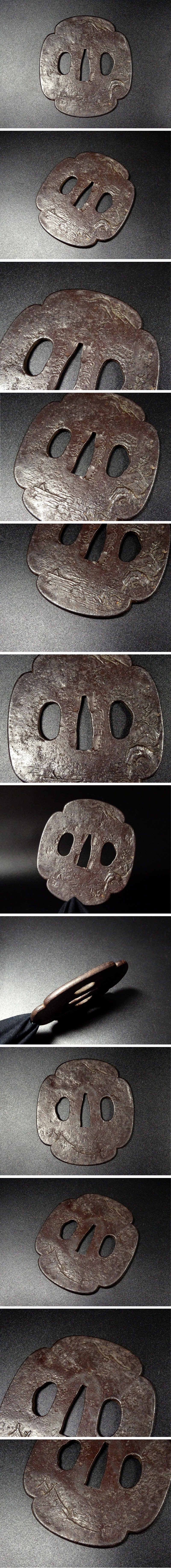 【敬逢】秀逸 刀装具 山水図鐔 銘【山城國伏見 金家】 木瓜形 鉄地 高彫 金象嵌色絵 両櫃孔 大鍔 金家鐔 TSSY24 收藏