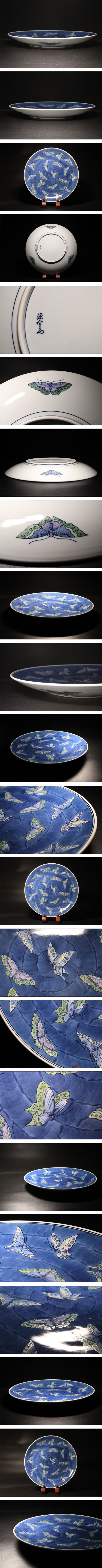 □■大型名品約40cm!源右衛門 染錦蝶絵皿 大皿 飾皿 料理皿 目を引く逸品!■□懐石 料亭 割烹 收藏