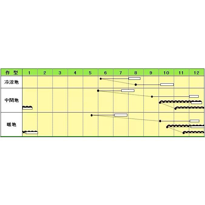 | 草姿は立性で尻張りが良く葉型はやや細めの長円形で厚みがあり、葉色は濃くつやがあります。葉数が多いので収穫時に外葉を多めに切り落としても形が崩れず、荷姿が美しい。葉柄はやや細めだが肉厚の中脚となります。収穫までの日数は他の交配種よりも2~3日多くかかりますが強健で作りやすい。夏期栽培で問題となる節間伸長が少なく株揃いが良いので上物を多収できます。また、特にハウス栽培で出やすいカッピング症状も少ない。 ※種子は播種後の栽培条件、天候事情により、その結果が異なる場合がございます。万が一、結果不良でも保証はできかねます。 【栽培のポイント】 ・元肥中心で、10アール当たり苦土石灰100kg、各成分量で15kg程度とし、夏場半分位に減肥してください。堆肥などの有機物は十分施肥すると良いです。 ・普通は幅120cm~150cmの畝に高温期は15×15cm・低温期は12cm×12cmの栽植距離で2~3粒ずつ点播し、本菜2~3枚までに間引く、移植栽培の場合は100cm~120cmの畝に7~8cmで条蒔きするかバラ蒔きして、子菜展開後に密生している所を1cm間隔となるように間引いてください。また、育苗箱やプラグポットなどを利用するところが増えています。育苗中は乾燥や多湿に注意し、均一な苗を作るように心掛ける。 ・露地では株間を15×15cm前後とし、ハウスではやや広げて15×18cm前後とし本葉3枚前後で定植してください。活着までは十分灌水し、活着後は控えめにし節間の伸長を抑えます。葉が重なりはじめたら少量多回数の灌水を行い、株が倒れるのを防いでください。 ・露地では白寒冷紗などのトンネル、ハウスでは、遮光ネットなどを利用し、虫害・温度上昇を防いでください。 |
