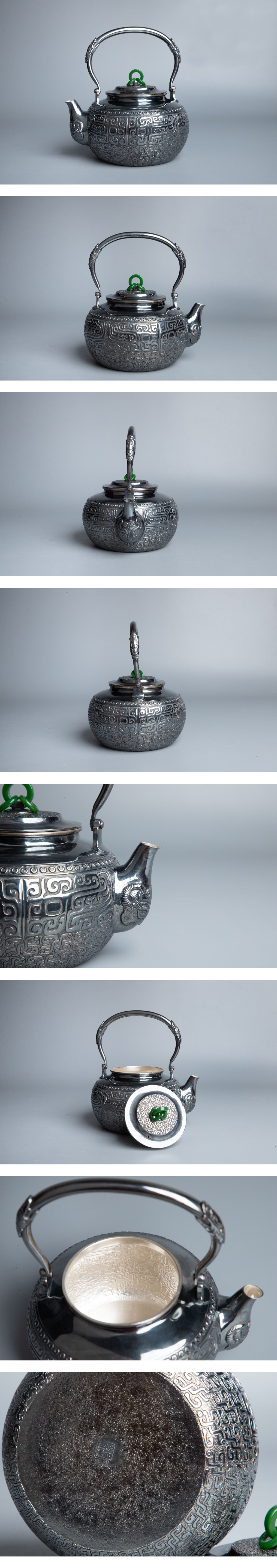 時代 純銀製 蔵六居造 饕餮文 三連環玉摘蓋 湯沸 工芸品 古美術品 銀瓶 煎茶道具 重さ829G 收藏