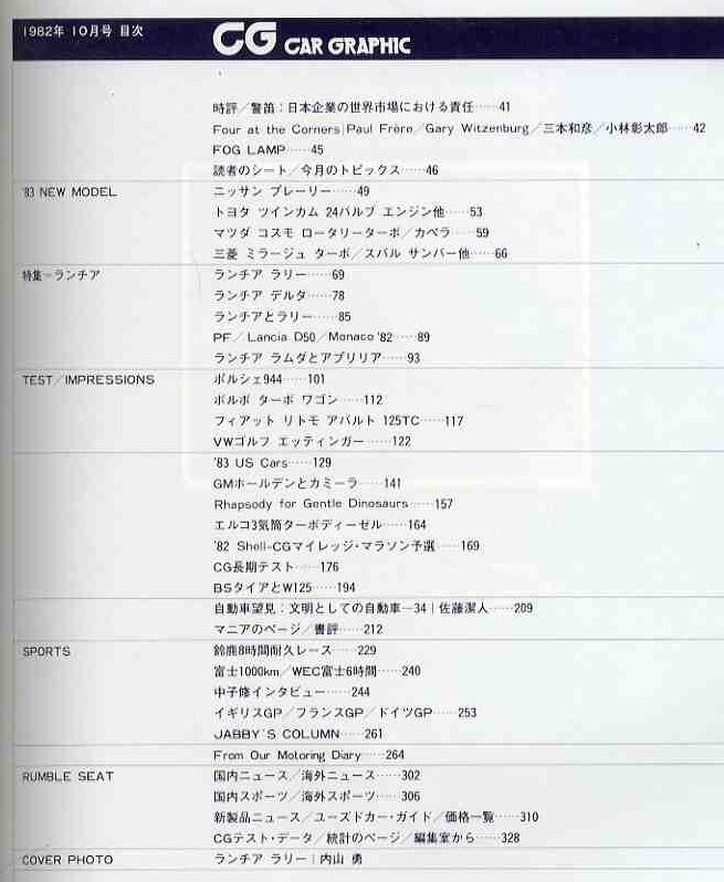 書名/記事: 82.10 カーグラフィック(CAR GRAPHIC)/特集=ランチア - ランチアラリー,ランチアデルタ1500,ランチアフルヴィアHFの時代,ランチアD50,1926ランチアラムダ,1938ランチアアプリリア、ポルシェ944、'83国産ニューモデル-ニッサンプレーリー,トヨタ26気筒ツインカム・24バルブ,トヨタ2.4ターボ・ディーゼル,トヨタビスタ/カムリ,トヨタスターレット,マツダコスモ/ルーチェロータリーターボ,三菱ミラージュⅡ4ドアハッチバック1400ターボ/4ドアサルーン1400GTターボ,三菱ランサーフィオーレ1400GTターボ、三菱ミニキャブ4WD、CGマイレッジマラソン予選、フィアットリトモアバルト125TC、ゴルフGTIエッティンガー1600E/16、ボルボターボワゴン、'83アメリカ車、ホールデンカミーラ、イギリスGP、ドイツGP、フランスGP、鈴鹿8時間耐久オートバイレース、富士1000kmレース、トムス童夢セリカC、…