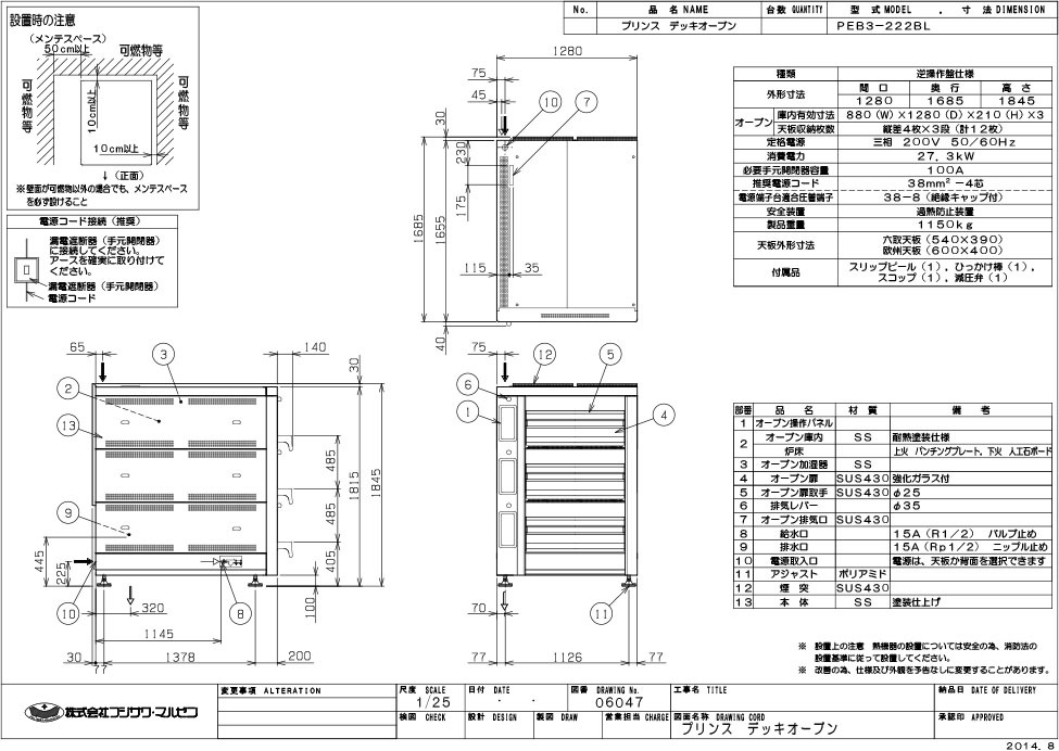 オーブン庫内有効寸法:880(W)×1280(D)×210(H)×3