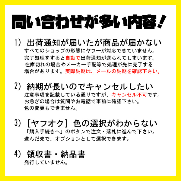| 1.オークション注文(お急ぎの場合は落札前に納期確認をお願い致します。) 2.!より入力受付完了の自動返信メールが届きます。 3.当店よりメーカー在庫確認後、納期・合計金額のご案内メールをお届けします。 4.メールにて商品発送完了もしくはメーカー直送依頼完了をご案内致します。 ※直送、入荷待ちの方へ この時点で手続き上、「完了」となります。そのため、ヤフーより入荷待ちでも「発送完了」のお知らせが届きます。 正しい納期は当店からの納期メールの案内となります。混乱を招いて申し訳ございませんが、仕様上の問題となります。 |