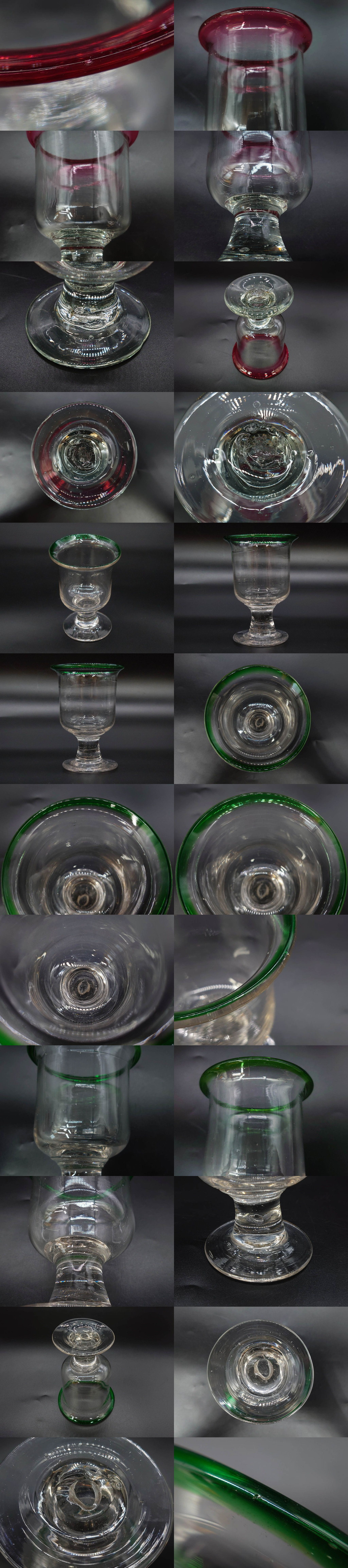 R-083278 当時物 大正~昭和初期 棗型(なつめ形) 赤縁 緑縁 乳白ぼかし 氷コップ3点セット(ベル型?,吹きガラス,硝子,グラス,和ガラス) 收藏