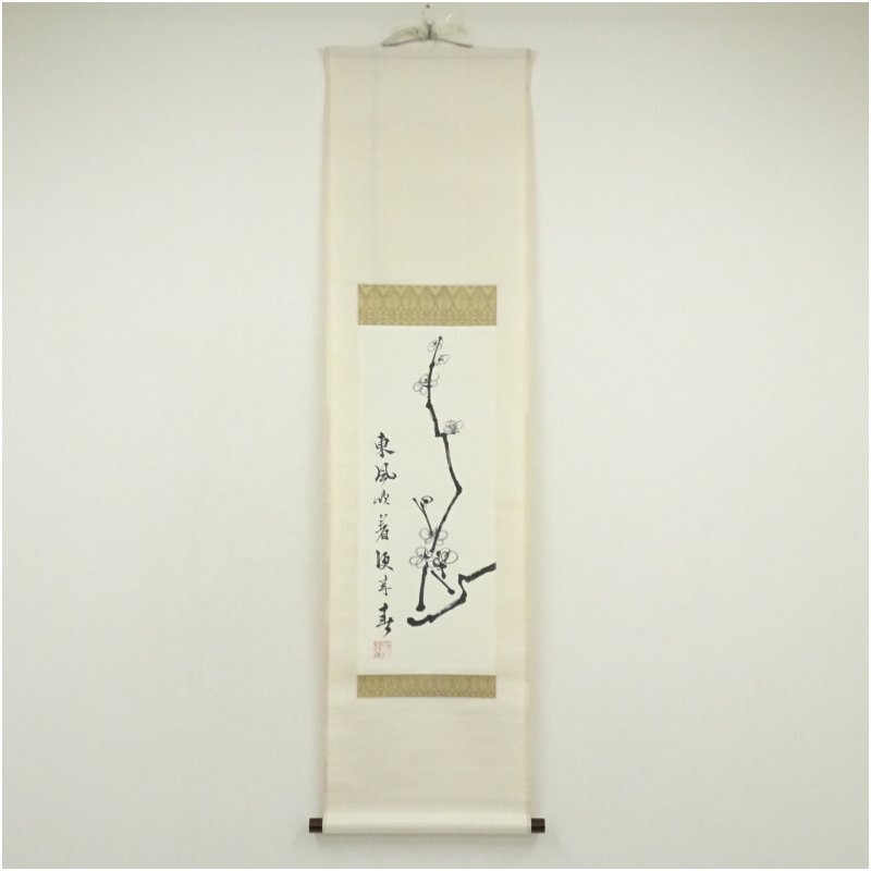 一茶庵 佃一輝(萬山)筆 「東風吹」梅画賛 肉筆紙本掛軸(共箱) 收藏