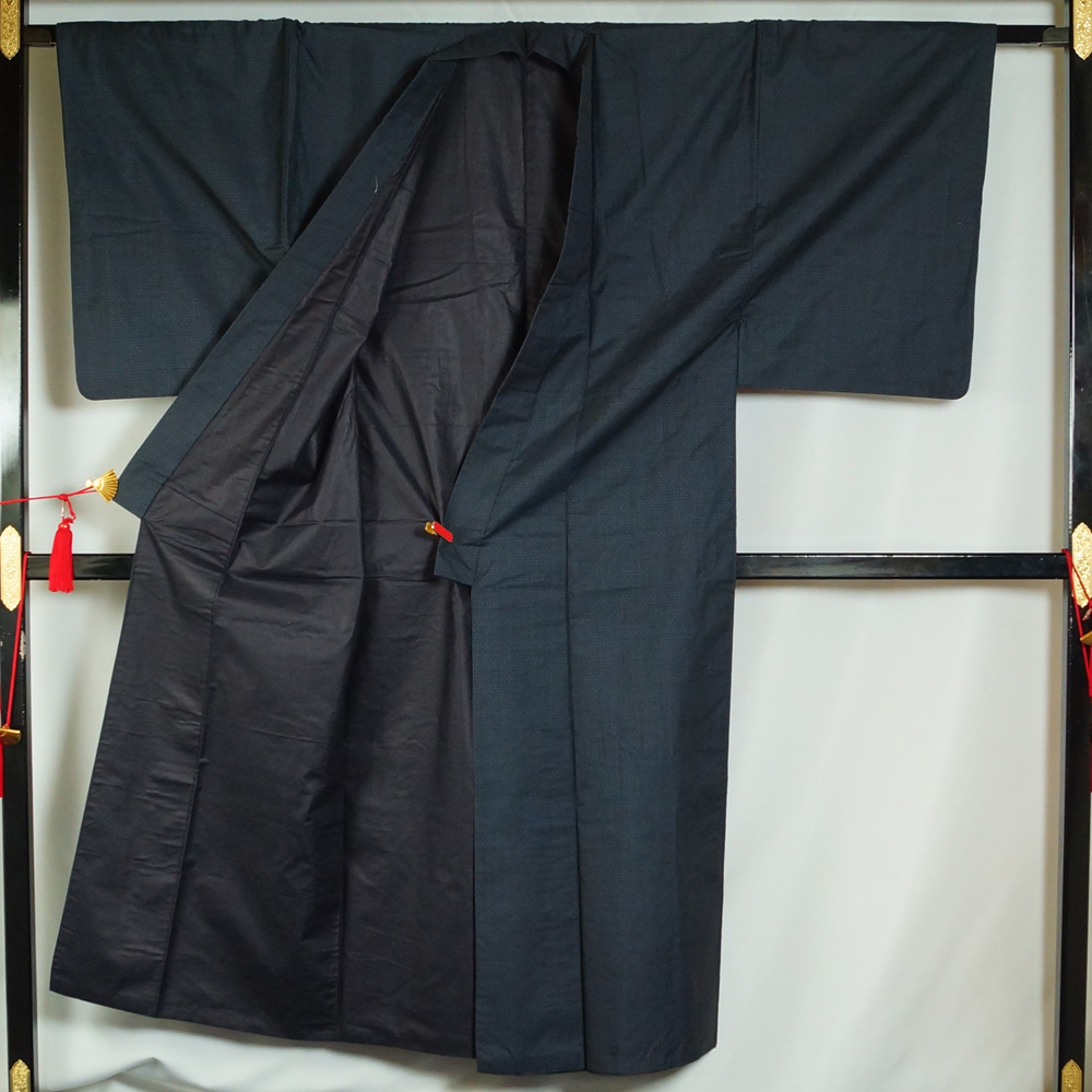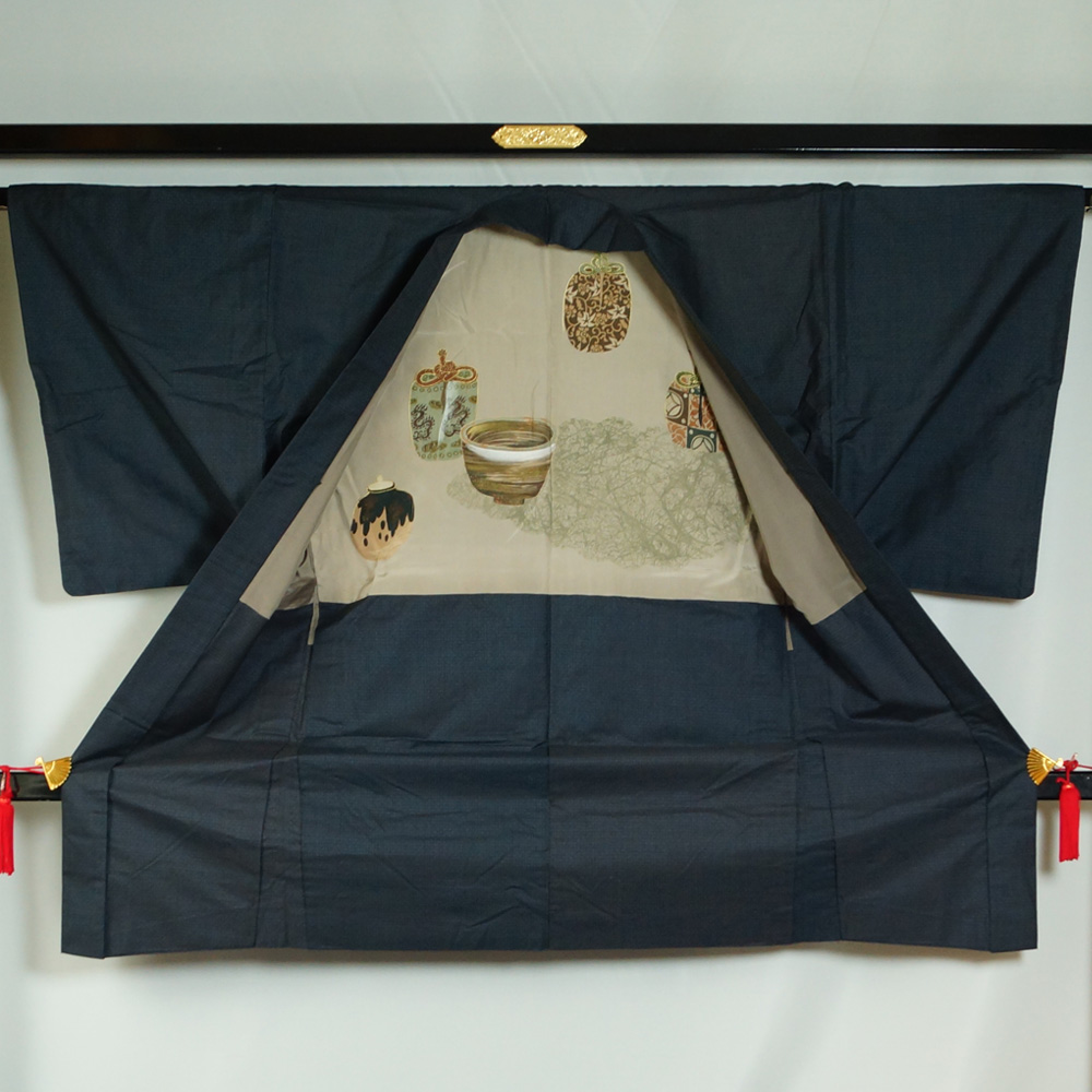 | 商品 説明 | 肌当たりのなめらかな平織の濃藍色系の地に幾何学的な模様が織られた大島紬の着物と羽織のアンサンブルです。羽裏は棗、お茶器模様です。羽織紐・証紙は付いておりません。 |