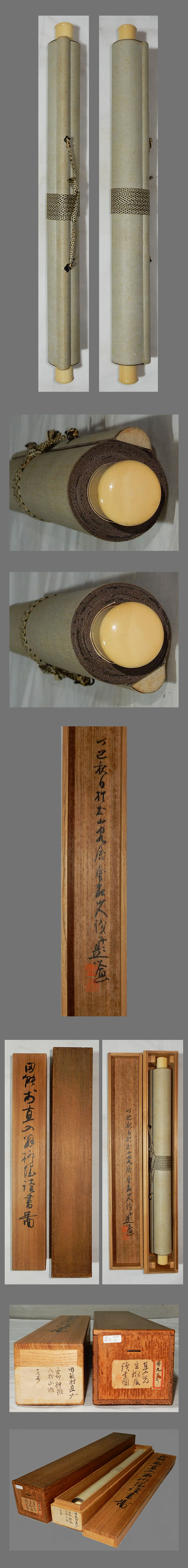 ・掛軸の軸先ですが、細心の注意を払って梱包しておりますが、 配送中の振動・気温・経年劣化等で外れてしまうことがあります。 軸先の外れは、破損ではございませんので、返品の対象にはなりません。 大変お手数ですが、お客様ご自身での修復をお願い致します。 ・添付写真の画像と説明文でご理解頂ける方、ご入札を宜しくお願い致します。 ・添付写真の画像は撮影の光度により、現物と若干の色合いの相違が生じる事があります。 ・添付写真の画像は受取完了のご連絡を頂いた後に速やかに消去しますのでご了承下さい。 ・土・日・祝日はお休みさせて頂きますので、商品発送は、月曜日以降になります。 ・祝日の場合は、翌日の平日以降の発送になります。 ・土・日・祝日は、メールの返信が若干遅れる事がございます。どうか、ご了承下さい。 ・時間的に余裕がない場合などでお答えが出来ない事も多々有ります。 ご不明な点は落札日前日までに早めにご質問下さい。 ・商品トラブルがあった場合は、直ちにご連絡下さい。 お取引に付きましては迅速・丁寧に対応させて頂きます。 ・落札後、できるだけ2日以内に連絡(返信)を頂ける方、 5日以内にご入金できる方の御入札を御願い致します。 ・新規の方や評価の総評が悪い方は当方の判断にて、入札取り消しを行う場合がございます。 ・お取引に付きましては、迅速、丁寧に対応致しますのでどうぞ、宜しくお願い致します。 ・古美術品や古物や古書画の出品が多いため、神経質な方がご入札される場合は、 ご自身が納得の行く価格でご入札ください。 ・万一、ヤフーのシステム障害により、公正なオークションができなかったまま終了し、 落札者様にご落札された場合は、当方より取引ナビで取引中止のご連絡を致します。 その時は、どうか、ご了承をお願い致します。 ・終了当日・直前の入札の取り消しは、 トラブルの原因となりますのでご遠慮お願い致します。 ・入札後の取り消し(キャンセル)は行っておりません。 ・落札後のキャンセル・返品はお断りしてます。 入札前によくご確認頂き、間違いのないようにご注意下さい。 |