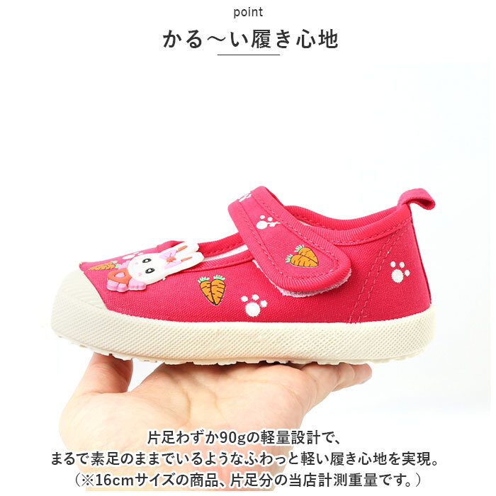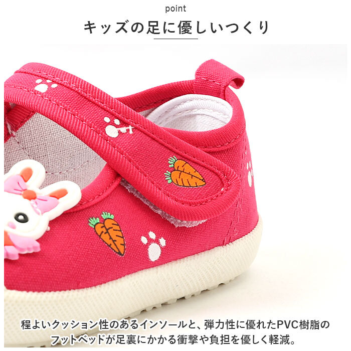 | 商品説明 | ・・スクールライフをキュートなウサギさんが応援!ポップな絵柄が楽しい「キッズ用スクールシューズ(上履き)」が新登場。 ・【キッズの足に優しいつくり】 ・程よいクッション性のあるインソールと、弾力性に優れたPVC樹脂のフットベッドが足裏にかかる衝撃や負担を優しく軽減。 ・【かる~い履き心地】 ・片足わずか90gの軽量設計で、まるで素足のままでいるようなふわっと軽い履き心地を実現。(※16cmサイズの商品、片足分の当店計測重量です。) ・【丸いカタチがつま先をガード】 ・アウトソール先端は、つま先部分を包み込むように丸いフォルムに仕上げ、うっかりつま先をぶつけてしまっても痛くない安心仕様。 ・【スポッと履けて、脱げにくい!】 ・混雑する学校の昇降口でもスポッと履ける!面ファスナーベルトが足の甲にぴったりとフィットして、脱ぎ履きスムーズ。 ・【滑りにくいアウトソール】 ・細かい凹凸を刻んだアウトソールが、フラットなフロアーや階段でもしっかりとグリップするから、活発なキッズでも安心。 ・【抜群の動きやすさ】 ・屈曲性に優れたアウトソールは動きやすさも抜群。軽くて動きやすいため、体育館での運動やダンスのような習い事にも大活躍! ・【お手入れ簡単、いつでも清潔】 ・インソールは取り外しができるので、手軽に水洗いができていつでも清潔さをキープ。 ・【POP&キュートなデザイン】 ・羽根の生えたウサギさんエンジェルがスクールライフをエスコート!ピンクを基調にしたガーリーなデザインで、足元をキュートに演出♪ |