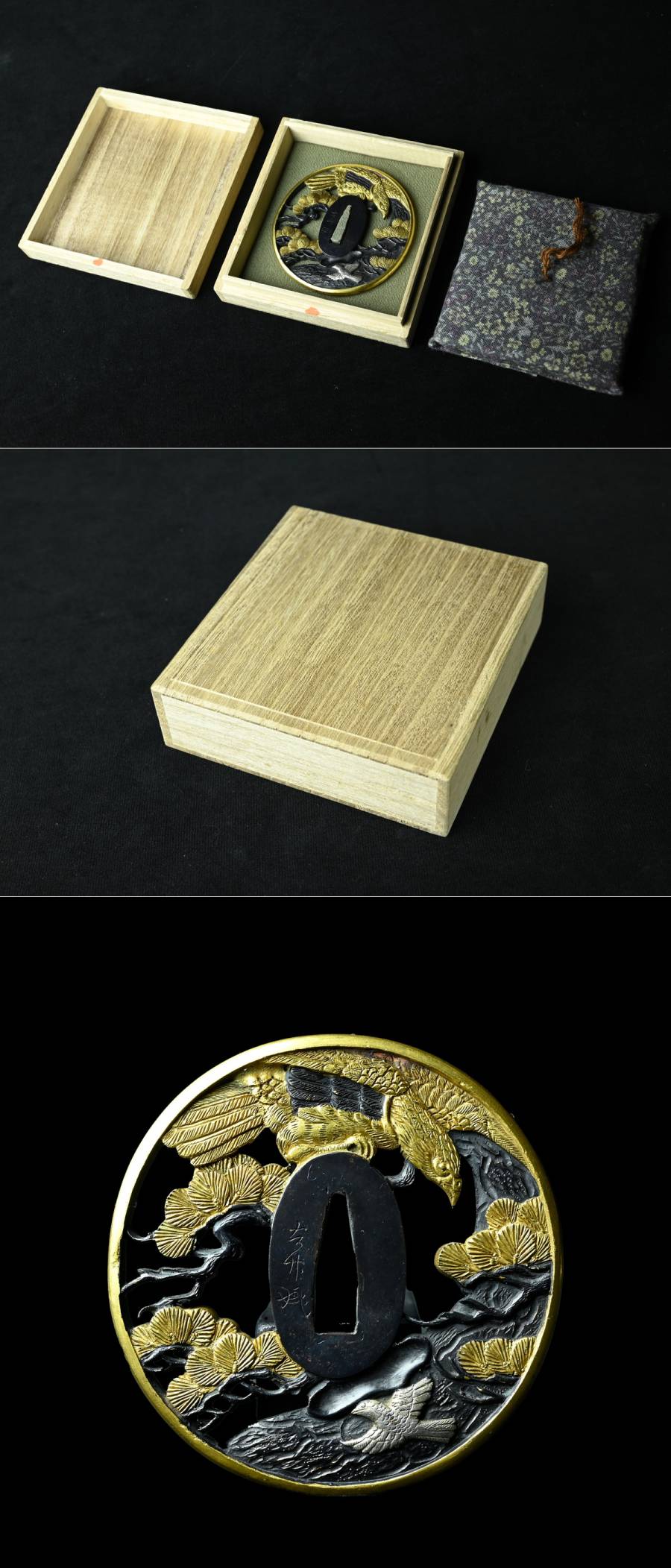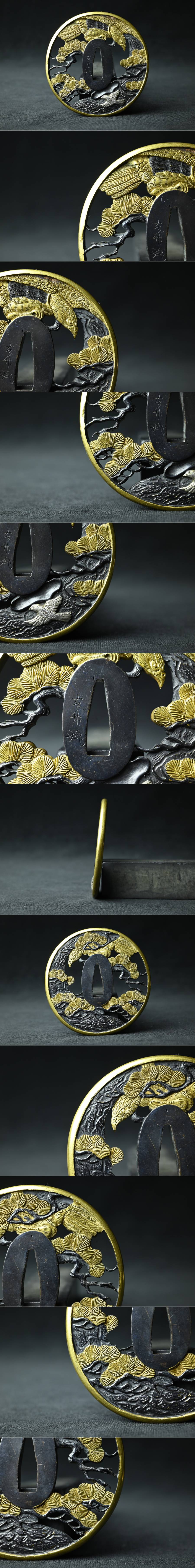 【昊】時代 金覆輪 金象嵌松鷹図透鐔 鍔 在銘(花押) 刀装具[NS26Is] 收藏