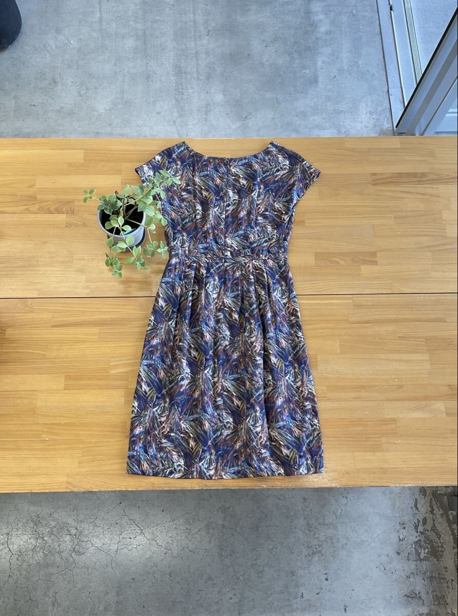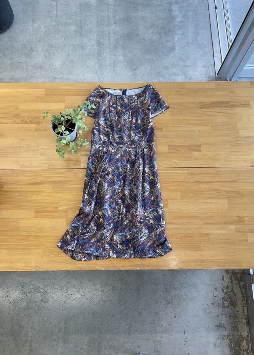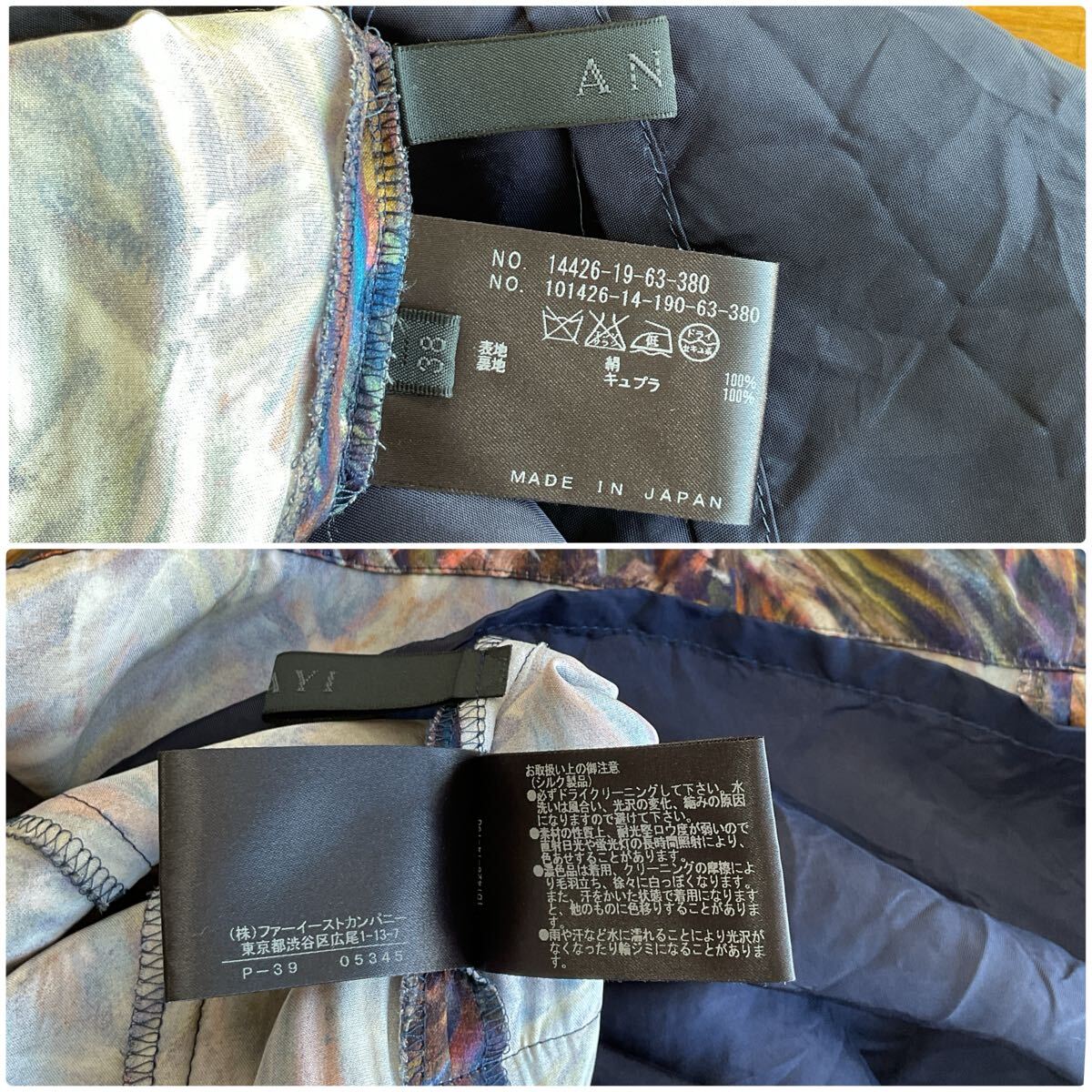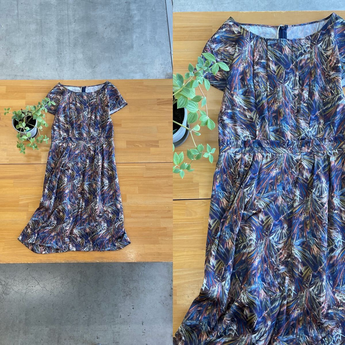 美品 ANAYI アナイ 総柄とろみ素材タック入りワンピース 光沢生地ウエスト切替ノースリーブフレアロングチュニック ネイビー紺茶色系 38 q 收藏
