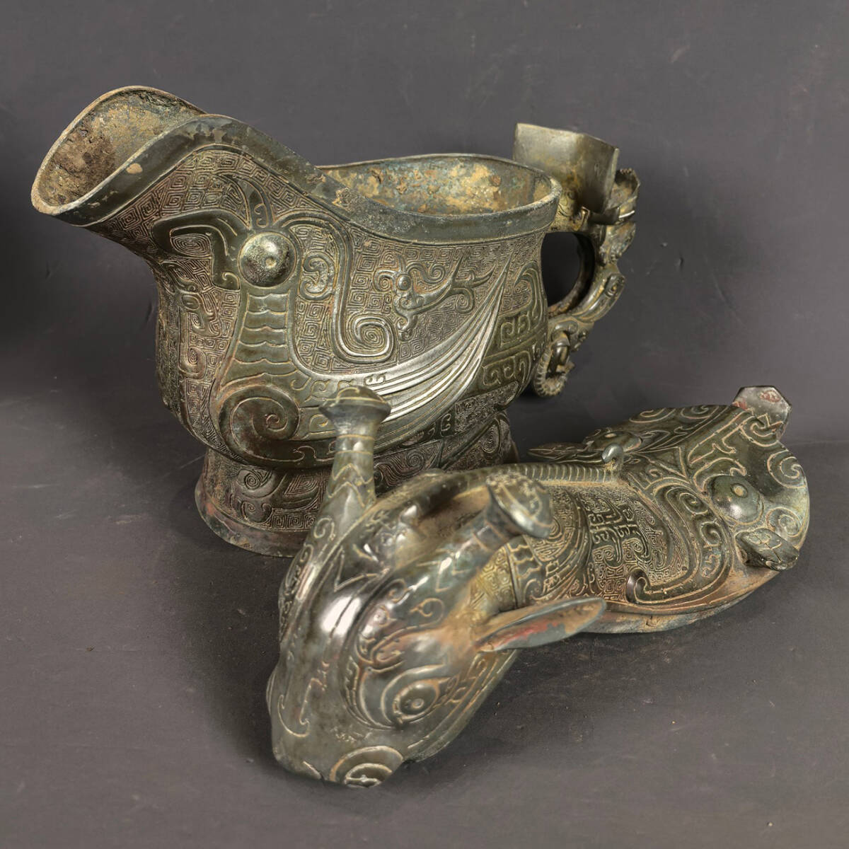 ◆御泓軒◆『商周時代 青銅器 鳳鳥紋蓋尊 酒器』極細工・古賞物・中国古玩・中国古美術