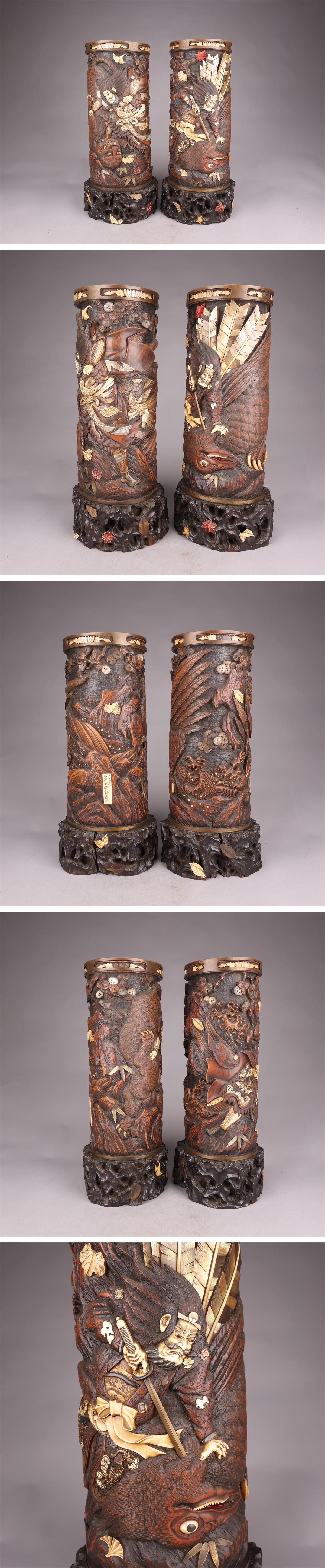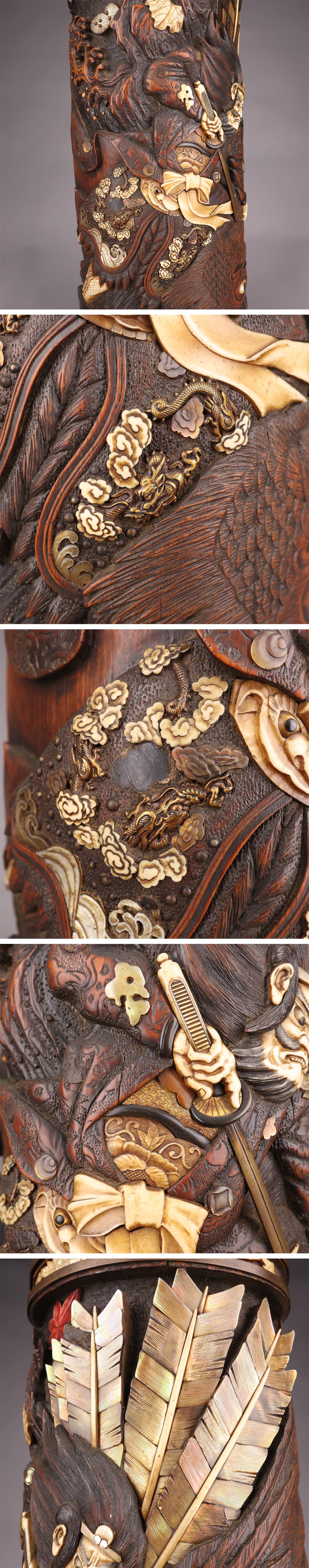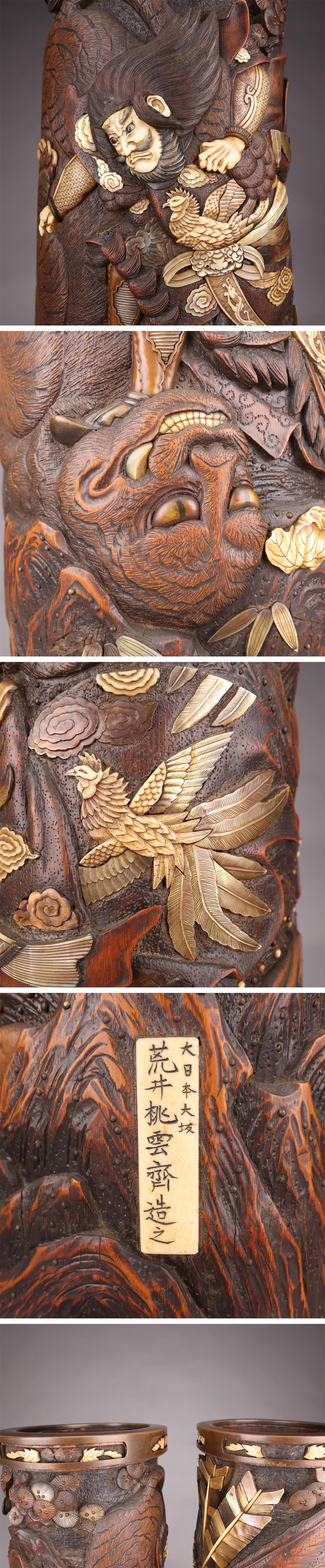 【志】A903置物一対 芝山象嵌 荒井桃雲斎作 武士 東洋彫刻 螺鈿 玉眼 箱付き 傷有}== 收藏