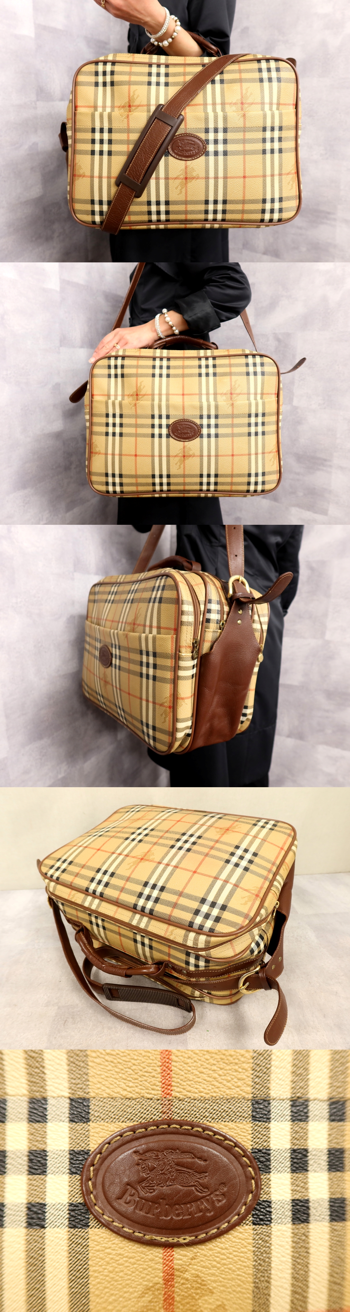 美品●BURBERRY バーバリー●ノバチェック●ロゴ型押し●PVC カーフ レザー 本革●2way ボストン バッグ●ベージュ ブラウン●A4●Js62249 收藏