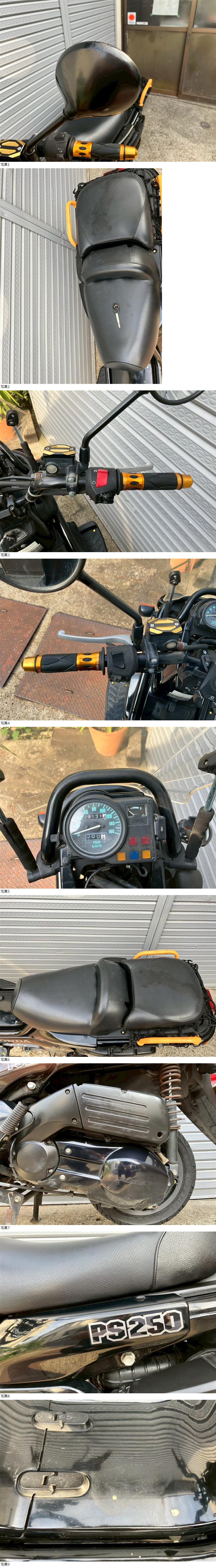 | 商品説明 | この度は当出品車両をご覧頂きまして誠に有難う御座います。 他にも複数台出品がございますので宜しければご覧ください! ご入札頂けた際には文末にありますお取引詳細にご同意頂けたものとさせて頂きます。 下記車両詳細・お取引詳細になりますので必ずご一読くださいませ! また、直接お越しいただいた方にその場で販売することもあるため予告なしに出品の取り消し等をする場合も御座います。 よって、落札前には一言コメント欄にてご一報頂けますと幸いです。予めご了承下さい。 〜〜車両詳細〜〜 メーカー:ホンダ 車種:PS250 年式:2006年式 色:黒 鍵:純正キー1本 排気量:250cc 走行距離:29,131km 燃料供給装置:キャブレター フレームNo:MF09-1201XXX 人気の後期型!丸目二灯のPS250入荷いたしました☆ ・外観 一部小傷やちょっとした塗装のハゲが御座います。 外装自体は艶もありそれなりには好印象です。 状態は写真にてご確認ください。 オプション品として社外ハンドル。フロントスクリーン、グラブバー他色、ETC、ぐりっぴヒーターなど御座います。 ・エンジンセルにて始動O K! 吹け上がり良好! 確認箇所は以下となります。 スピードメーター:作動OK! ヘッドライト:ハイロー点灯! ウィンカー:前後左右点灯! テール:尾灯・ブレーキ共に点灯! ナンバー灯:点灯! ホーン:作動OK! 燃料計:不動 ★別途部品交換受け付けます! ・タイヤ前後交換など!詳細は直接お問い合わせくださいませ! エンジンオイル・タイヤ交換など! 詳細は直接お問い合わせくださいませ! *上記ご利用の際は部品の在庫状況によりお引き渡しまでにお時間を頂戴する場合が御座います。 〜〜お取引詳細〜〜 ※ご注意ください※ 出品車両はあくまで現状販売となります。走行点検などは行っておりません。 良好・好印象などの表記に関しても車両の状態を確実に保証するものではなく 細かい程度の差なども含めあくまで当方の主観でありますこと重々ご承知置き下さい。 特別に気になる箇所など(外観に限ります)がある場合は直接ご相談ください。 ご指定いただきました箇所のお写真を添付をさせていただきます。 (あまりにも多い場合はご対応致しかねます。) 上記を踏まえまして現車の確認は大歓迎です。 細かい箇所など気になる方は是非とも現車確認を行ってください! (予約制となりますので直接お問い合わせください。) 一般の二輪販売店と同様の点検・整備は行っておりません。 車両に関する一切の保証等も御座いませんので自走でのお引き取りはお断り致します。 ある程度の知識があり落札後にご自身で整備の出来る方、或いは整備工場等にて分解整備を別途検討できる方、メンテナンスベースとしての使用などの落札を推奨しております。 明記してあること以外の確認はしておらず、また致しかねます。 目視できる消耗品以外のパーツに関しましても寿命のわからぬものなど御座います。 (中古品ですのでつい先程まで正常に作動していたにも関わらずお受け取りの際に状態の変化などある場合も十分御座います。例・電子機器、ワイヤー類など) 再三にはなりますが如何なる場合もお引き渡し後のキャンセル・クレームはお受け致しかねます。 現状販売というものを重々ご理解の上ノークレーム・ノーリターンでよろしくお願い致します。 原則キャンセルはお受け致しかねますが、止むを得ず落札者様都合でキャンセルされる場合には 落札金額の1割をキャンセル費用として頂戴させて頂きます。 上記取引内容に不安を感じられる方には二輪販売店等の整備・保証付き車両のご購入を強くお勧め致します。 ★直接引き取り・即引き取り大歓迎! 直接引き取りの場合、落札から1週間以内にお引き取り下さい。 それ以降日割りにて2,200円を別途頂戴させて頂きます。 *部品交換をご依頼の方は完成のご連絡から1週間以内となります。 ★配送OK! 主に配送業者に委託しております。ご自身で手配いただいても結構です。 レッドラインの金額を参考にしておりますのでお手数ですが費用に関しましては落札者様にて直接HPでご確認下さい。 発送元は埼玉県川口市となります。ご購入から配送までの目安は関東近郊で1〜2週間程度となるかと思います。(地域、期間により大幅に異なりますので納期が気になる方は直接レッドラインへお問い合わせ下さい。) 関東近郊の場合割増でお早めにお届けできる場合も御座いますので一度ご相談下さいませ!(対象外となる場合も御座います。) また、配送の場合もお取置き等の対応は致しかねますので落札後は速やかに配送依頼の手続きを行わせて頂きます。 ★車両のみの販売となりますので必要な場合のみ別途5,500円にて販売証明書の発行・発送を受け賜ります! ★新規アカウントの方、落札者様の評価内容によりましては、ご入札頂いても当方の判断で削除する場合がございます。予めご了承下さい。 ★落札後、24時間以内にお客様情報のご入力・落札代金のお支払いがいただけない方のお取引はキャンセルと