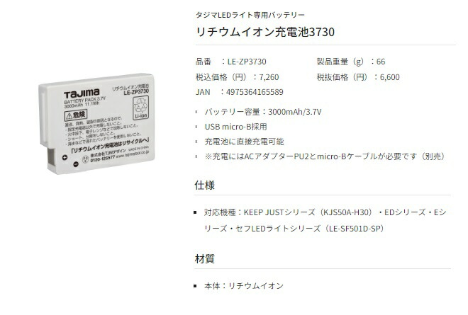 タジマ TAJIMAタジマLEDライト専用バッテリーリチウムイオン充電池3730 LE-ZP3730■特長・バッテリー容量:3000mAh/3.7V・USB micro-B採用・充電池に直接充電可能・※充電にはACアダプターPU2とmicro-Bケーブルが必要です(別売)■仕様・対応機種:KEEP JUSTシリーズ(KJS50A-H30)・EDシリーズ・Eシリーズ・セフLEDライトシリーズ(LE-SF501D-SP)■材質・本体:リチウムイオン