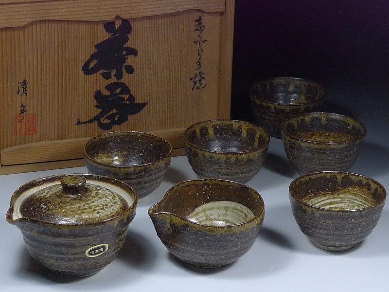 8020L01*11B▲煎茶道具 信楽焼 清宇造 茶器揃 共箱付 宝瓶 湯冷まし 湯呑 五客揃 陶器 茶道具 收藏