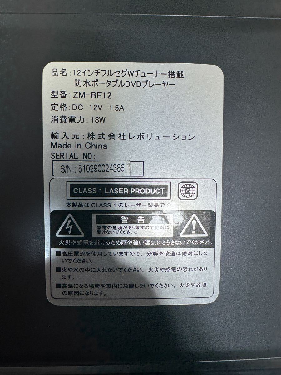 12インチ防水ポータブルDVDプレーヤ ZM-BF12S 本体のみ 中古品