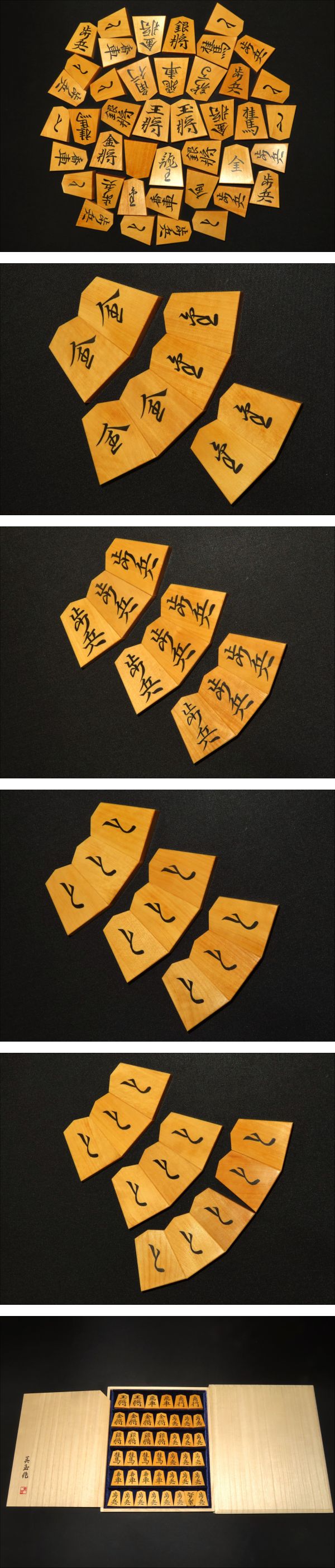 木地は御蔵島黄楊上柾目。ご覧のとおり味の良い木地です。全ての駒の表裏をUPしてございます。是非ご覧下さい。