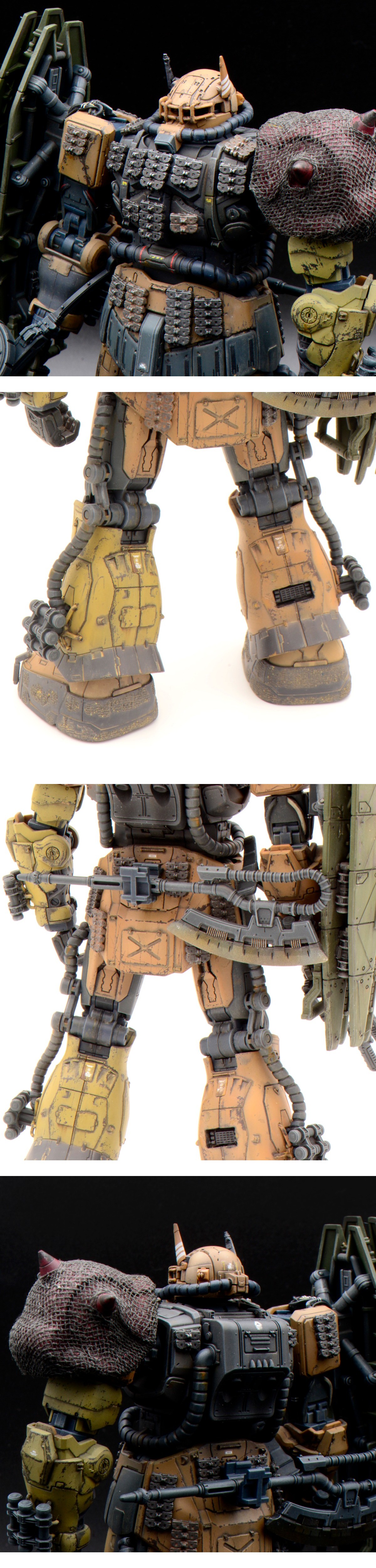 ●バンダイ製の「HG 1/144 ザクII F型 ソラリ機」及び「ソラリ機再現パーツセット」キットを使用しています。●付属するものは写真に写っているものが全てです。●基本は説明書指示に合わせていますが、一部不明な部分は本編CGモデルなどを参考に再現しています。●塗装前までの基本的な工作、パーティングラインや合わせ目処理は可能な限り行っています。●腕部と脚部のミサイルポッド基部の支柱は全て金属線に交換しています。●脚部のツェメリットコーティングはポリパテとコーティングブレードで再現しています。●スパイクにかかった偽装網のようネットは医療用ガーゼで再現しています。●シールドに脱落防止/偽装用のロープをナイロンリギングで再現しています。●シールド基部にビニールコードを使用してディテールを追加しています。●頭部アンテナはシャープに加工しつつディテールを整えています。●脚部の一部外装ハッチが脱落した部分は内部のディテールをそれらしく再現しています。●素組で十分なスタイルに思えましたので「何処どこを何ミリ延長」というようなスタイル変更工作は行っていません。●下地処理はオキサイドレッド+黒のサーフェイサーを使用しています。●ケープ剥がしをするためケープ(3Dエキストラ)でコートし、その後基本塗装を行っています。●塗装レシピは指示のある部分は説明書通りに、それ以外の黄色系はダークイエロー、緑系にはNATOグリーンを使用しています。●基本塗装にはラッカー及びアクリル系を、細部の一部にはエナメル塗料も併せて使用しています。●基本塗装終了後にケープ剥がしを行っています。●デカールを張り付け後、ウォッシングやドッティングなどを行い経年を表現しています。●すべての塗装工程終了後、クリアー部分以外はつや消しクリアーで軽くコーティングしてあります。●最後に動力パイプからのオイル漏れをクリアー系塗料で加筆しています。●写真はなるべく実物の色味に近くなるよう努力しておりますが、多少の差異がありますこと何卒ご了承ください。※モノアイが上手く撮影できていませんがきちんと作業してあります。