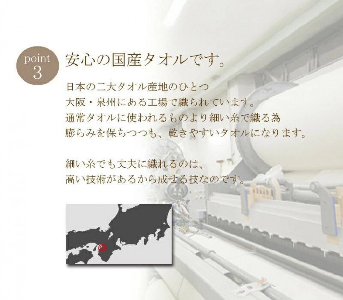 | 内側二層の無撚糸(ムネンシ)で、膨らみのある柔らかな風合いを出しています。綿の繊細さ、やさしさを極めたバスタオルです。 |