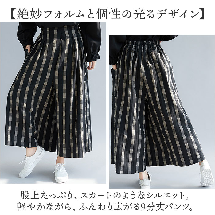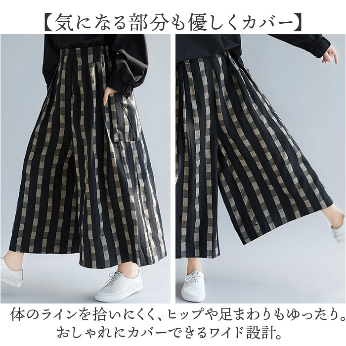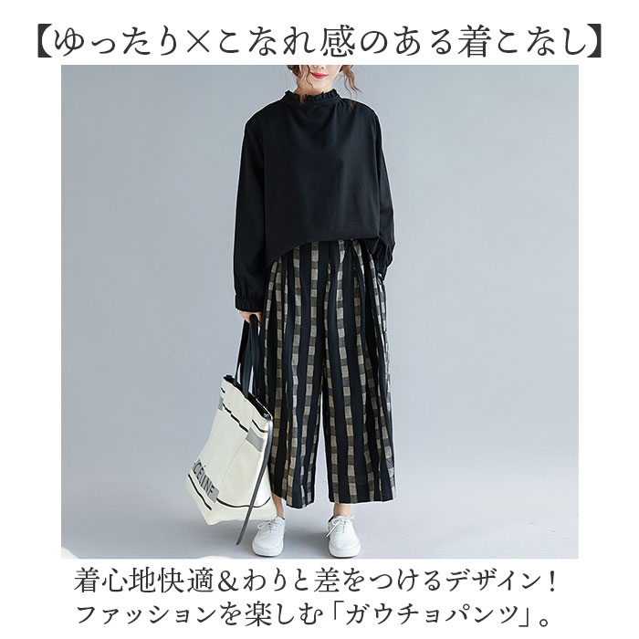 | 商品説明 | ・・【ゆったり×こなれ感のある着こなし】 ・着心地快適&わりと差をつけるデザイン!ファッションを楽しむ「ガウチョパンツ」。 ・【絶妙フォルムと個性の光るデザイン】 ・股上たっぷり、スカートのようなシルエット。軽やかながら、ふんわり広がる9分丈パンツ。 ・【気になる部分も優しくカバー】 ・体のラインを拾いにくく、ヒップや足まわりもゆったり。おしゃれにカバーできるワイド設計。 ・【締め付け感がなくストレスフリー】 ・自分サイズにフィットするバックゴム仕様。着脱もしやすく、フロントからの見た目もすっきり。 ・【小物を入れておける左右ポケット】 ・左右に配置されたポケットには、スマホや薄手のハンカチなどをIN。 ・【コーデの幅が広がる万能アイテム】 ・オーバーサイズのスウェットなどと合わせてルーズに。タイトなトップスも相性抜群。 ・【カジュアルなチェックデザイン】 ・落ち着きのあるナチュラル感が魅力。色んなシーンで活躍する、大人可愛いガウチョパンツ♪ |