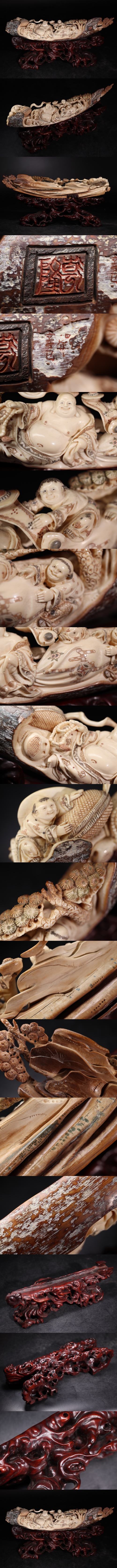 乾隆 款 マンモス製 布袋 ・ 唐子 彫刻 唐木 台座付 / 中国美術 仏教美術 マンモス 彩色 細密 置物 .G3591 收藏
