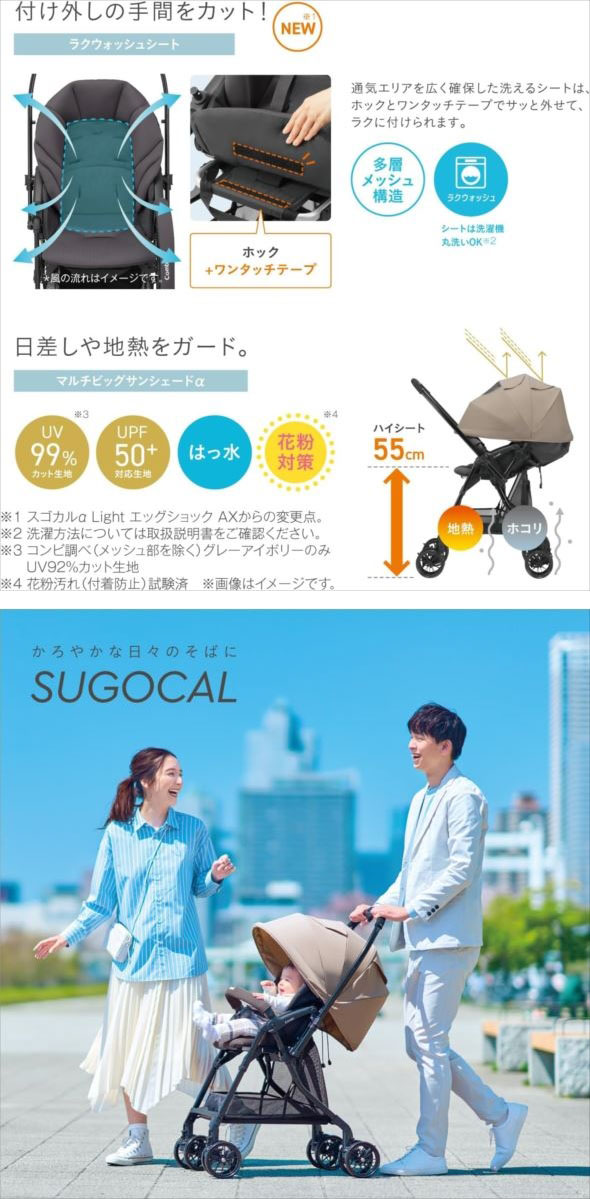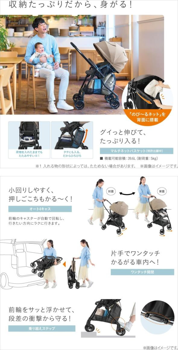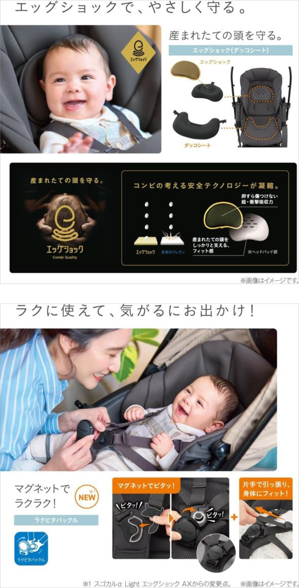 【商品特長】 ◆マグネットで簡単にベルト装着ができる、ラクピタバックルを搭載。バックルを近づけると、ピタッとくっつき、 乗せ降ろしがもっとラクに!さらに、ベルトを引っ張るだけで、肩・腰ベルトがまとめて締まり、サッと調整できます。 ◆背面の間口に伸縮するマルチネットバスケットを搭載。荷物がたっぷり入って、落ちづらくなりました。 さらに、荷物を入れたままでもたたみやすい形状です。積載可能容積39.6L(耐荷重:5kg) ※入れる物の形状によっては、たためない場合があります。 ◆体温調節の苦手な赤ちゃんのために、頭部から座部まで通気エリを拡大した多層メッシュ構造の エアスルーシートを採用。シートは洗濯機で丸洗いができます。 ◆押しても乗り越えられないような大きな段差でも、乗り越えステップがあるのでラクラク安心です。 ◆脇に抱えて、片手で楽に持ち運べるグリップを座面に搭載。 グラつかずに安定してベビーカーが持てる、コンビだけのカタチです。 ◆卵を落としても割れないほどの超・衝撃吸収素材「エッグショック」を頭部のクッションに内蔵し、 産まれたての頭を守ります。 ◆地面の熱や、ほこりから赤ちゃんを遠ざけます。ママとの距離も近くなって、抱っこしやすい55cmのハイシートです。 ◆マルチビックサンシェードα 撥水加工・UVカット生地を使用した幌でスッポリ覆い、直射日光や紫外線から守ります。 | |||||||||||