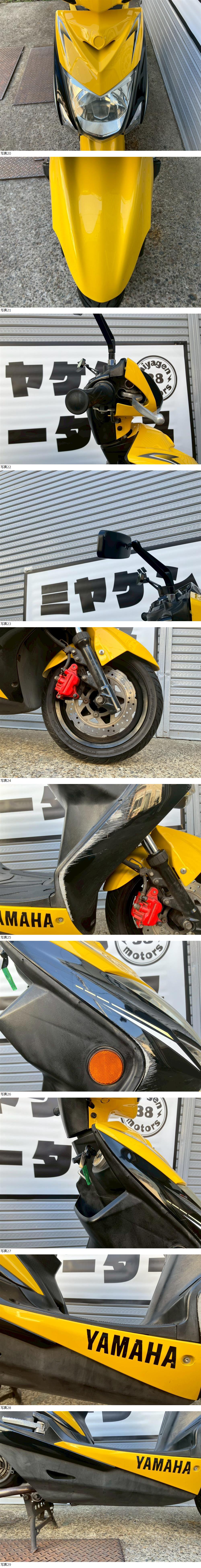 | 商品説明 | この度は当出品車両をご覧頂きまして誠に有難う御座います。 他にも複数台出品がございますので宜しければご覧ください! ご入札頂けた際には文末にありますお取引詳細にご同意頂けたものとさせて頂きます。 下記車両詳細・お取引詳細になりますので必ずご一読くださいませ! また、直接お越しいただいた方にその場で販売することもあるため予告なしに出品の取り消し等をする場合も御座います。 よって、落札前には一言コメント欄にてご一報頂けますと幸いです。予めご了承下さい。 〜〜車両詳細〜〜 メーカー:ヤマハ 車種:シグナスX SR 年式:2013年式 色:黒 鍵:純正キー2本 排気量:110cc 走行距離:15066km 燃料供給装置:インジェクション フレームNo:SE44J-32**** 別途 5500円で販売証明書発行致します お気軽にお問合せ下さい。 ・外観 シグナスXSRのSE44Jモデルが入荷いたしました☆ 社外マフラーが搭載されており、純正マフラーと違っていい音がしています! 黄色のカラーリングがかっこいいですね♪ ★別途部品交換受け付けます! ・タイヤ前後交換など!詳細は直接お問い合わせくださいませ! エンジンオイル・タイヤ交換など! 詳細は直接お問い合わせくださいませ! *上記ご利用の際は部品の在庫状況によりお引き渡しまでにお時間を頂戴する場合が御座います。 〜〜お取引詳細〜〜 ※ご注意ください※ 出品車両はあくまで現状販売となります。走行点検などは行っておりません。 良好・好印象などの表記に関しても車両の状態を確実に保証するものではなく 細かい程度の差なども含めあくまで当方の主観でありますこと重々ご承知置き下さい。 特別に気になる箇所など(外観に限ります)がある場合は直接ご相談ください。 ご指定いただきました箇所のお写真を添付をさせていただきます。 (あまりにも多い場合はご対応致しかねます。) 上記を踏まえまして現車の確認は大歓迎です。 細かい箇所など気になる方は是非とも現車確認を行ってください! (予約制となりますので直接お問い合わせください。) 一般の二輪販売店と同様の点検・整備は行っておりません。 車両に関する一切の保証等も御座いませんので自走でのお引き取りはお断り致します。 ある程度の知識があり落札後にご自身で整備の出来る方、或いは整備工場等にて分解整備を別途検討できる方、メンテナンスベースとしての使用などの落札を推奨しております。 明記してあること以外の確認はしておらず、また致しかねます。 目視できる消耗品以外のパーツに関しましても寿命のわからぬものなど御座います。 (中古品ですのでつい先程まで正常に作動していたにも関わらずお受け取りの際に状態の変化などある場合も十分御座います。例・電子機器、ワイヤー類など) 再三にはなりますが如何なる場合もお引き渡し後のキャンセル・クレームはお受け致しかねます。 現状販売というものを重々ご理解の上ノークレーム・ノーリターンでよろしくお願い致します。 原則キャンセルはお受け致しかねますが、止むを得ず落札者様都合でキャンセルされる場合には 落札金額の1割をキャンセル費用として頂戴させて頂きます。 上記取引内容に不安を感じられる方には二輪販売店等の整備・保証付き車両のご購入を強くお勧め致します。 ★直接引き取り・即引き取り大歓迎! 直接引き取りの場合、落札から1週間以内にお引き取り下さい。 それ以降日割りにて2,200円を別途頂戴させて頂きます。 *部品交換をご依頼の方は完成のご連絡から1週間以内となります。 ★配送OK! 主に配送業者に委託しております。ご自身で手配いただいても結構です。 レッドラインの金額を参考にしておりますのでお手数ですが費用に関しましては落札者様にて直接HPでご確認下さい。 発送元は埼玉県川口市となります。ご購入から配送までの目安は関東近郊で1〜2週間程度となるかと思います。(地域、期間により大幅に異なりますので納期が気になる方は直接レッドラインへお問い合わせ下さい。) 関東近郊の場合割増でお早めにお届けできる場合も御座いますので一度ご相談下さいませ!(対象外となる場合も御座います。) また、配送の場合もお取置き等の対応は致しかねますので落札後は速やかに配送依頼の手続きを行わせて頂きます。 ★車両のみの販売となりますので必要な場合のみ別途5,500円にて販売証明書の発行・発送を受け賜ります! ★新規アカウントの方、落札者様の評価内容によりましては、ご入札頂いても当方の判断で削除する場合がございます。予めご了承下さい。 ★落札後、24時間以内にお客様情報のご入力・落札代金のお支払いがいただけない方のお取引はキャンセルとさせていただきます。(お支払いに関しましては、どうしてもの場合大幅な期間でなければある程度ご相談にのらせていただきます。) 予めご了承くださいませ。 上記内容にご同意いただける方のみ、落札をご検討ください。 気持ちの良いお取引ができますようどうぞ宜しくお願いいたします