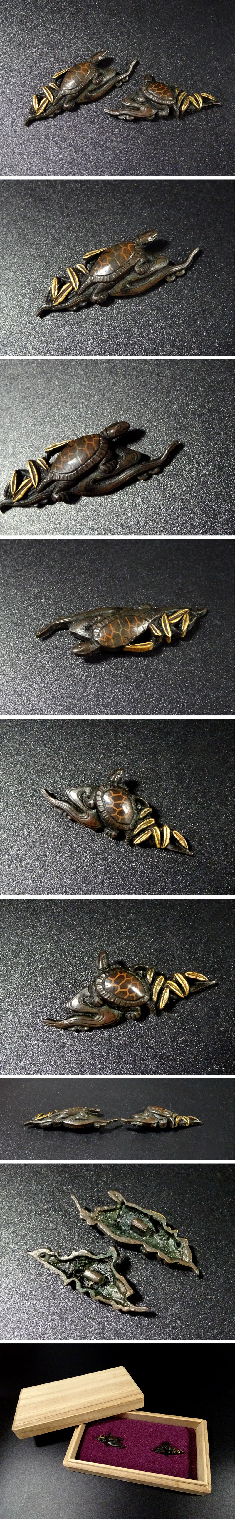 敬逢 秀逸 刀装具 亀に流水水草図目貫 無銘 赤銅地 容彫 金素銅象嵌色絵 極上細密細工 化粧箱付き 侍 SAMURAI TST-36 收藏