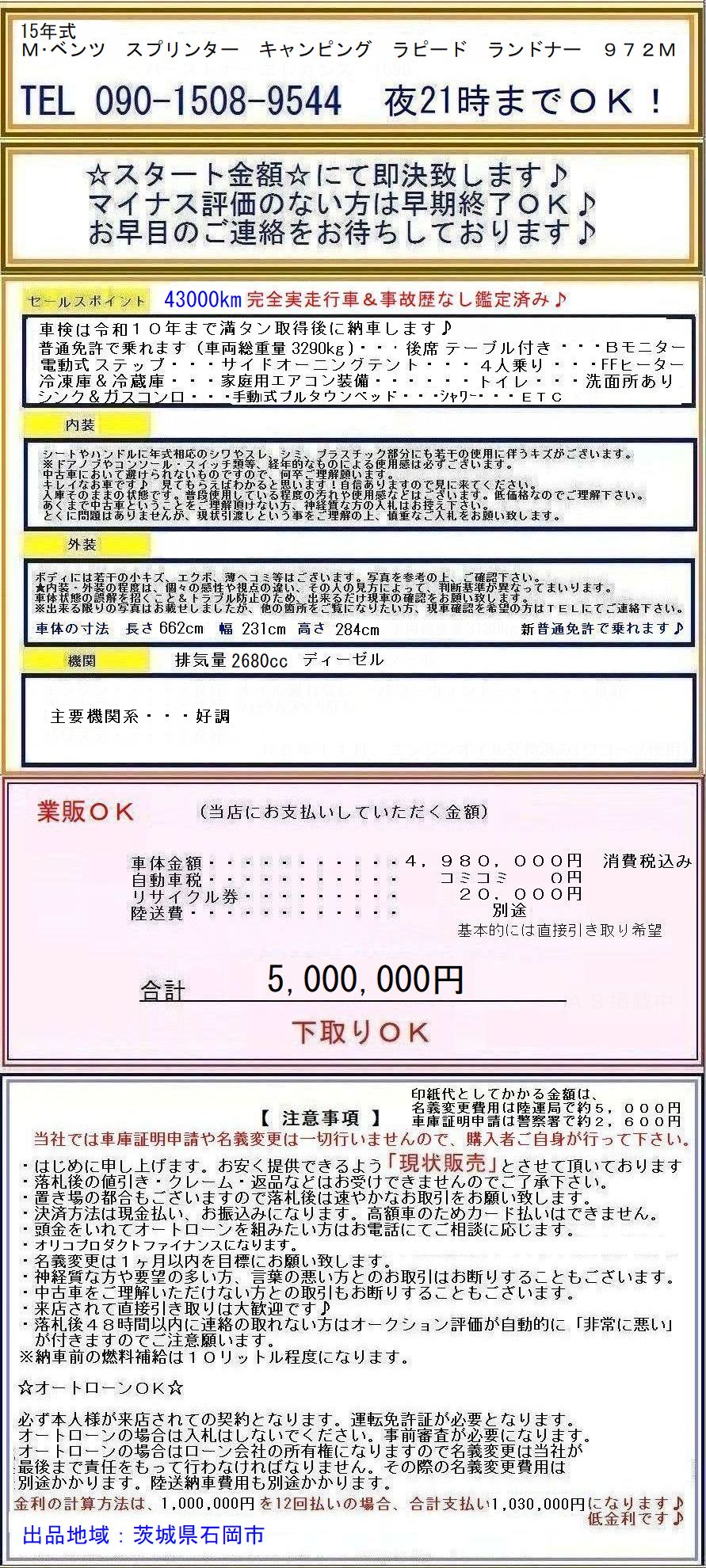 ベンツ スプリンター キャンピング ラピード ランドナー 972M 軽油 右ハン AT車 43,000km実走行&事故歴なし 車検満タン 茨城県 收藏
