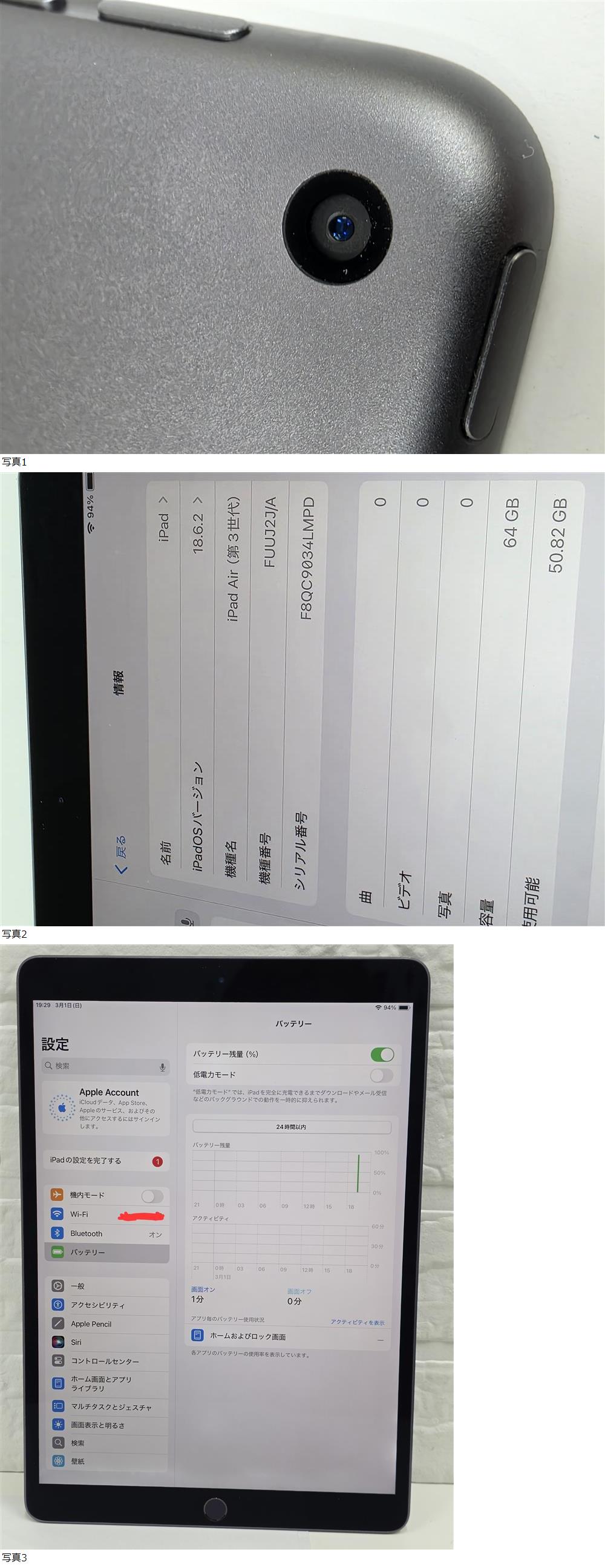 e8223■Apple iPad Air (第3世代) (10.5インチ) スペースグレイ 64GB FUUJ2J/A Wi-Fiモデル iOS18.6.2 收藏