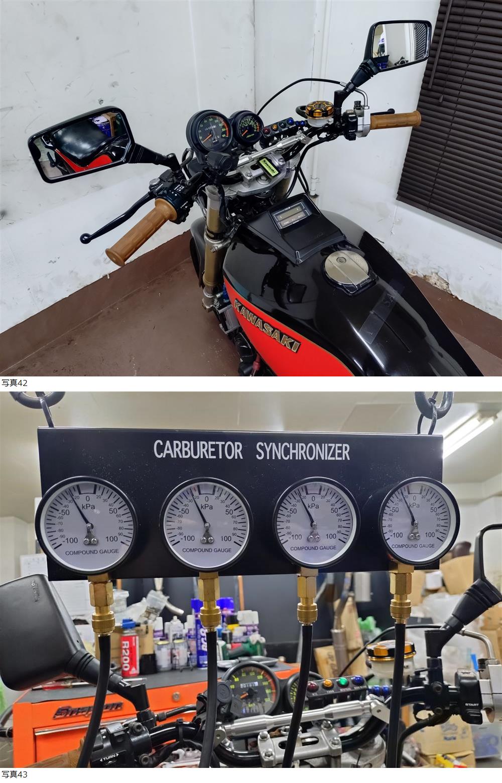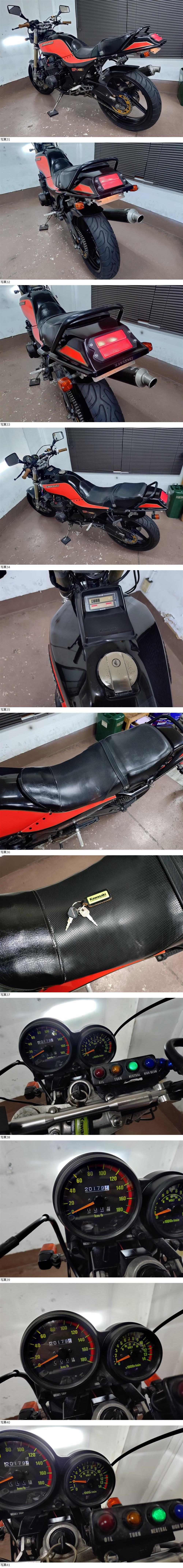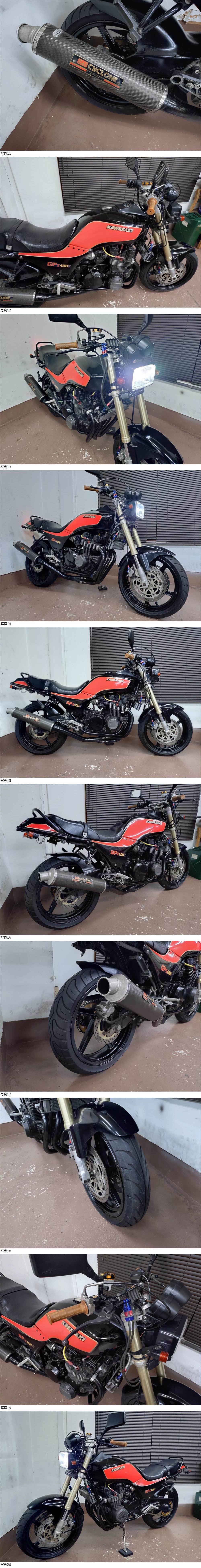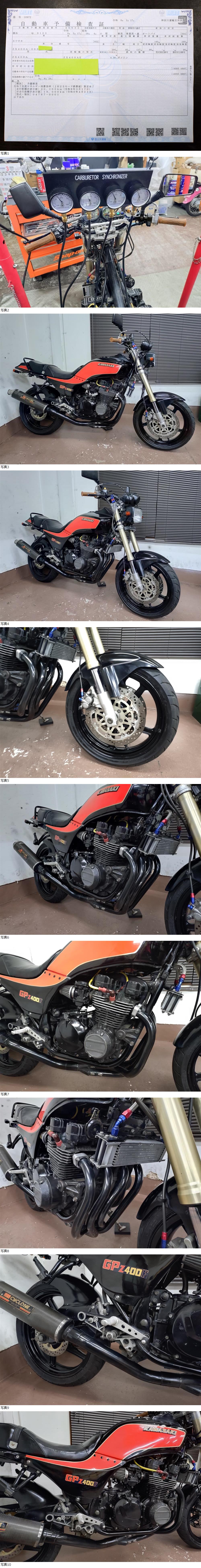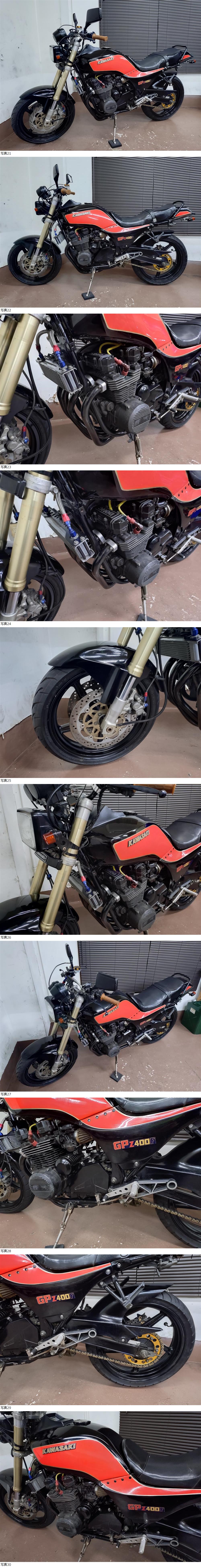 | 商品説明 | ★☆出品車両の拡大画像は冒頭または文末に掲載しております★☆ アクセス頂き有難うございます。 商品説明文を最後までご熟読頂き、オークションへのご参加およびお取引を、宜しくお願い申し上げます。 -------------------- ●車両基本情報 ・初年度登録年月:昭和58年4月 【国内物/昭和58年A1モデル】 ・型式:ZX400A(排ガス規制無しモデル) ・車台番号:ZX400A-003***(下3桁伏字) 【原動機番号:ZX400AE003878】⇒『乗せ換え無し』 ・メーター表示距離:20,180km(流通履歴上は実走行距離) 過去記載距離 20,100km/令和8年 19,000㎞/令和6年 ・キー:純正共通1本+社外スペア1本 ・エンジン始動:○ ・セルまたはキックスタート:○ ・バッテリー残量:○ ●【当方にて『走行テスト』実施済み】 ⇒正常制動・正常ミッション入力ほか確認済み ●保安部品の作動状態 ・ヘッドライトHI/LOW切替:○ ・ウインカー:○ ・ホーン:○ ・テールランプ:○ ・ブレーキランプ前後:○ ●ガソリンタンク内部の状態:内部コーティング施工 ●エンジンの状態 ・エンジン総合状態:年式/距離相応の状況 (特に大きな問題の無い一般中古車レベル) ⇒気になる際は必ず『現車確認』をお願い致します。 ・オイル漏れ箇所:- ・その他特記事項:顕著なオイル漏れ箇所は特に無し ●足回りの状態 ・ステムベアリングの状態:現状は問題なし ・フロントフォーク:現状オイル漏れ無し/ダストシールひび左右小程度 ・前後タイヤ残量:F 6分山 R 7分山 ●外装の状態 ・ガソリンタンク凹み:目立つような凹み箇所は特に無し ※各所劣化は当然ございます※ ・外観全体:基本的に年式相応とお考えください (多数の画像や始動確認動画の通りの一般的な実動中古車です) ※昭和時代の旧車にて各所劣化等全体的にあり※ (細かな内容は割愛) ~その他箇所は現車確認または、質問等にて対応承ります~ ⇒①より詳細把握のための現車確認(※諸条件あり・下記参照※)につきましては、質問欄より打診をお願い申し上げます。 ●その他特記事項: 車検は令和10年3月まで残あり 【=『車検2年満タン渡し』 です!!】 ※法定費用は落札金額に含みます※ ⇒『予備検渡し』の場合=落札金額より15,000円お値引き 修復歴無し(JABA管理システム上および当方現車確認による) ●お渡しする書類:あり (自動車検査証+自賠責保険証+譲渡証明書+ナンバープレート) ●その他情報 所謂、『国内物=昭和58年登録』のGPz400(国内A1)のカスタム多数車です。 現在『予備検査』までの取得は完了しております。 (⇒上記法定費用は落札金額に含みます) 割と魅力的なカスタム内容かつ、コンセプト的にまとまっている車体と当方は考えております。 +説明文冒頭に『(キャブレター同調風景含む)始動動画をアップ』致しましたので、内容をご確認くださいませ。 -------------------- 空冷旧車のため、以下2項目を追加で確認しています。 ①E/g圧縮⇒1番:10.2/2番:10.1/3番:9.9/4番:10,3 (サービスデータ上の規定値=7,7~12.0kg/cm) ②電圧昇圧⇒12,6~ピーク時13.9V付近 上記2項目、情報を追記しておきます。 -------------------- 製造から45年弱が経過した、昭和時代の旧車とはなりますが、現状わりと普通に走行可能です。 最近まで走行されていた車体となりますので、大まかなレストア箇所が各所確認されておりますが、更に手を加えれば、より良い車体になるかと考えます。 基本メンテナンス項目に於いて、お時間が無いユーザー様向けに各種メンテナンスメニューもご用意しておりますので、ご希望の際はご落札後にご用命くださいませ。 ☆★【落札金額=車検2年満タン渡し】☆★ (※法定費用含む・下記諸条件あり/要確認※) -------------------- 現在予備車検のみ取得しておりますが、当方にて中古新規登録を決済ご完了後、2~3日の間にて行います。 車検は【令和10年3月まで『2年車検満タン渡し』(※法定費用は全て落札金額に含みます)となりますので、その点含めぜひご検討くださいませ。 【⇒『予備検渡し』の場合=落札金額より15,000円お値引き】 -------------------- カスタム内容は、画像で判断可能な箇所です。 かなり多くの部分に手が加えられています。 前後ホイールはZXR250(F:17インチ/R:18インチ)+フロント足周りは同ZXR250倒立フォーク流用(ステムより)による、走りの仕様です。 また、『ハンドルロックは正常に使用可』となりますので、情報追記しておきます。 その他、ヨシムラサイクロンマフラー(車検対応品)をはじめ、バックステップ(形状的にはマッククレーン?)、PMC大容量オイルクーラー、テールランプ、NGKプラグコード+キャップ、ブレーキ周りほか、カスタム箇所多数です。 +パワーフィルター仕様等にて、キビキビと走れるような『走りに特化したカスタム内容』と、当方は考えておりますので、この点も踏まえての総合的なご検討を、どうぞ宜しくお願い致します。 軽い試乗の際は、細かな部分を除き、《走る/曲がる/止まる》という走行に関する基本的動作につきましては、特段大きな不具合は現状、感じられませんでした。 但し、わずかな