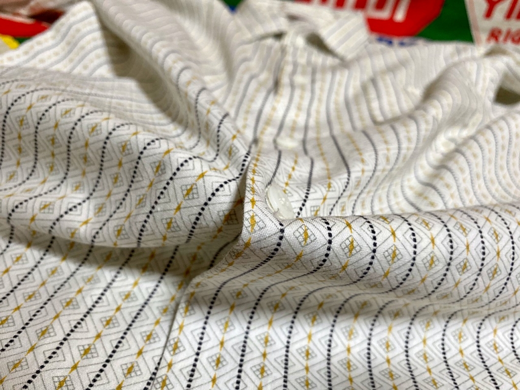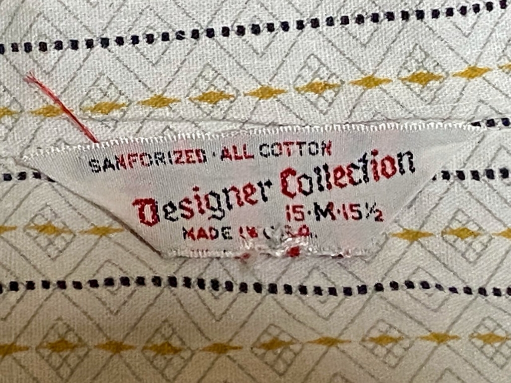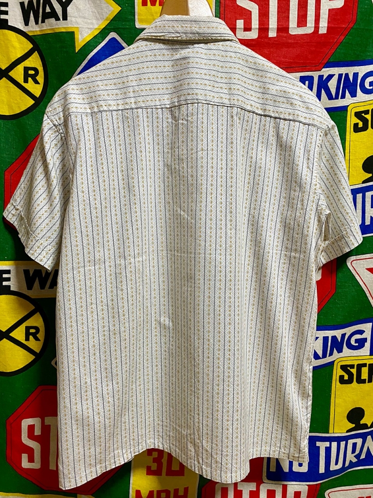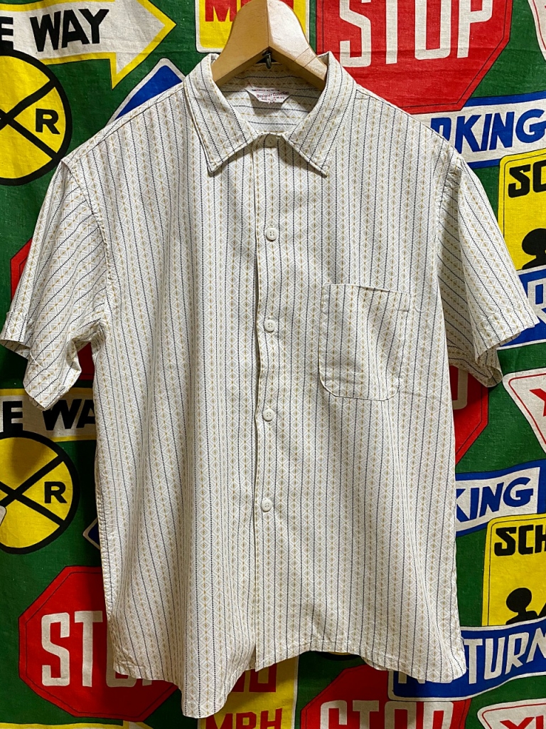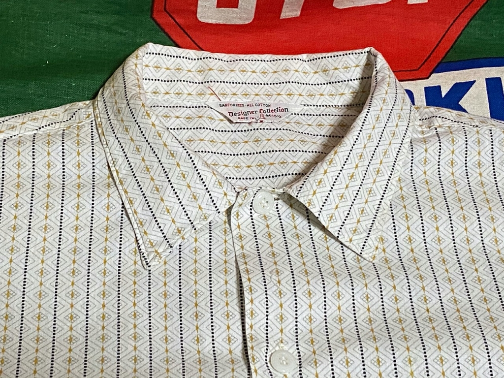 ★爽かな白ベース★Made in USA製アメリカ製Designer Collectionビンテージオープンカラーストライプ総柄プリントコットンシャツ60s60年代M 收藏