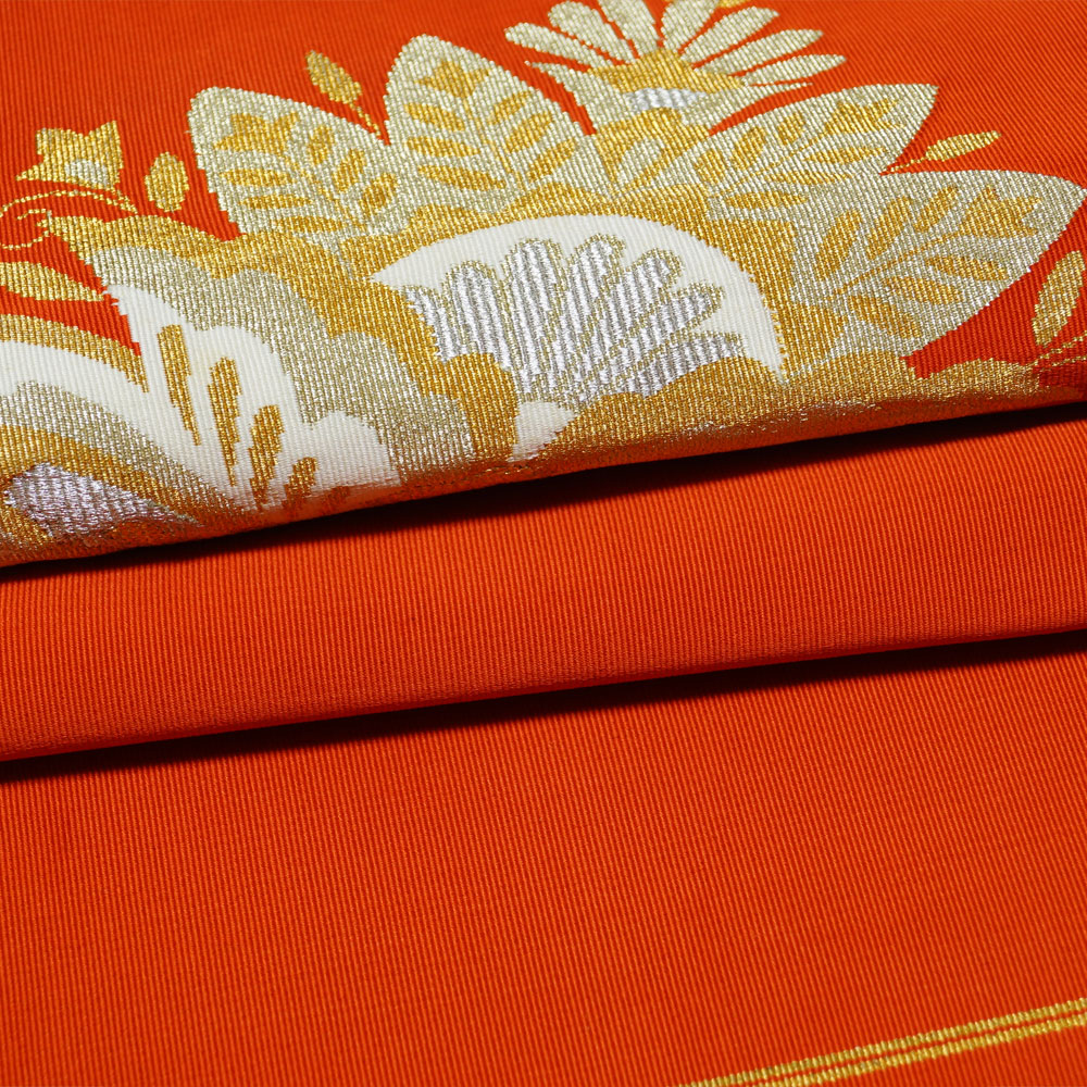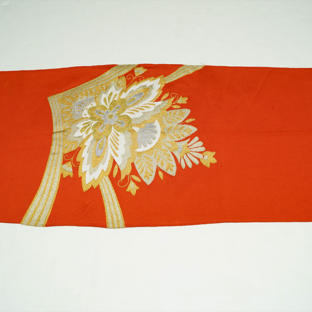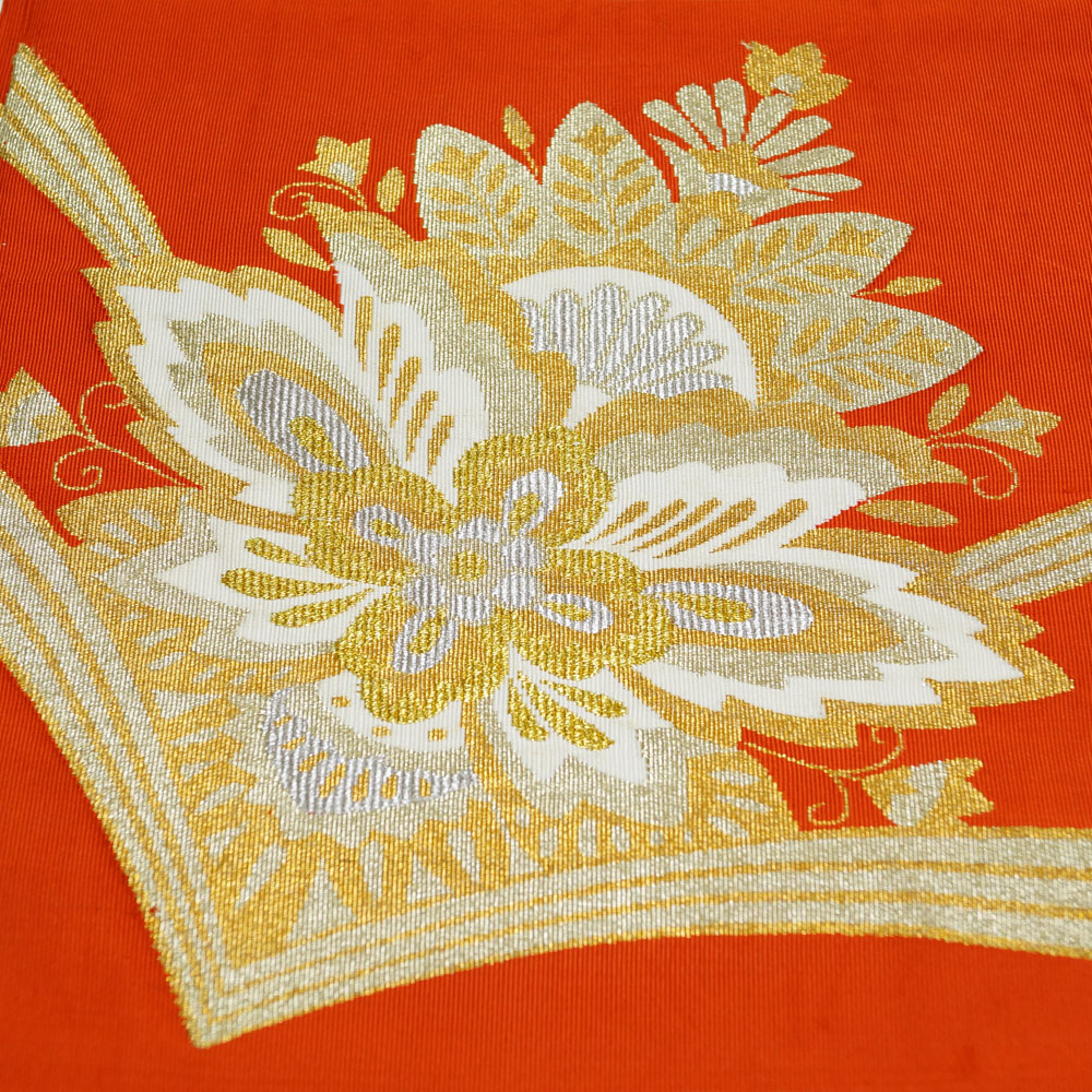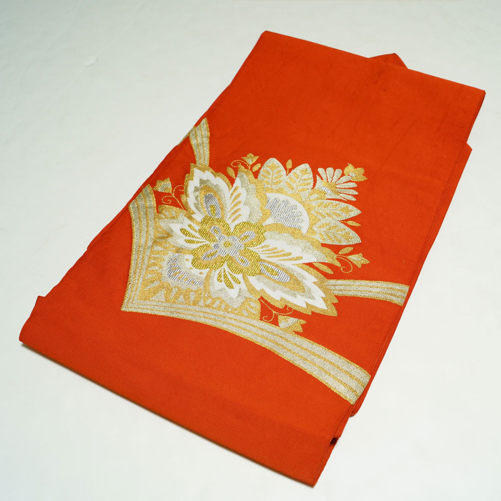 | 商品 説明 | 赤丹色系の綴れ地に唐花模様が織られた八寸名古屋帯です。 お太鼓部と前帯部だけ少し幅が広いです。 |