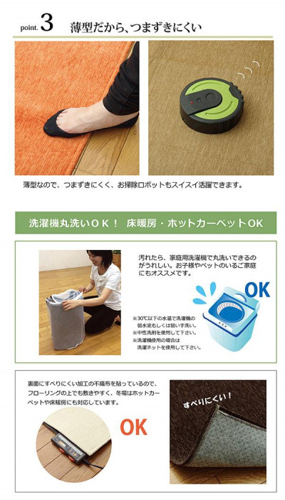 | 無地のシェニール織ラグです。毛足が短いためお掃除も簡単です。裏面にはフローリングの上でもご使用できるよう、滑りにくい加工を施しております。ホットカーペットカバーとしてもご使用できます。 |