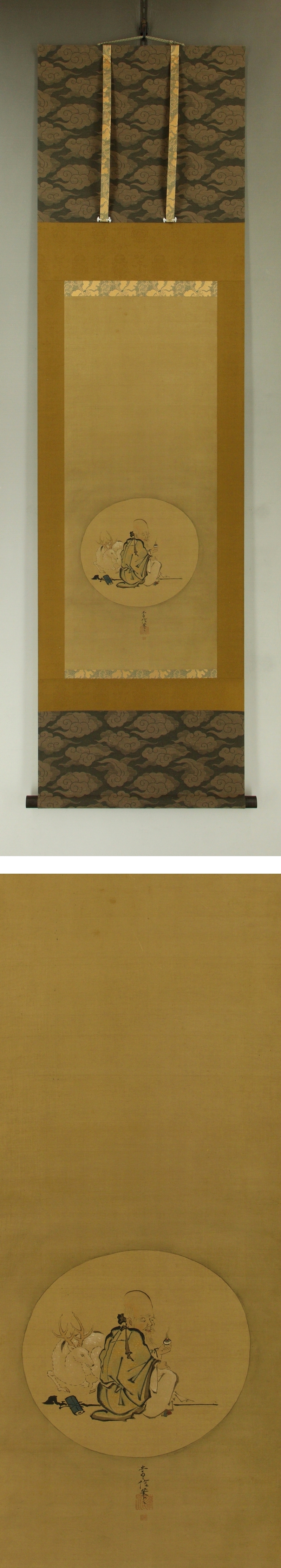 狩野常信 かのう-つねのぶ(1636-1713) 江戸時代前期-中期の画家。 寛永13年3月13日生まれ。狩野尚信の長男。慶安3年(1650)父の跡を継ぐ。 御所障壁画制作に参加し,宝永年間には狩野派の最高指導者として紫宸殿の「賢聖障子」を描く。 宝永6年法印。木挽町狩野家隆盛の基礎を固めた。正徳3年1月27日死去。78歳。 京都出身。通称は右近。号は養朴,古川叟。 本紙は、染み痕があります。 表装は、良好です。箱に破損があります。 【サイズ】 作品 横約36cm×縦約87.5cm 表装 横約49cm×縦約178cm |
